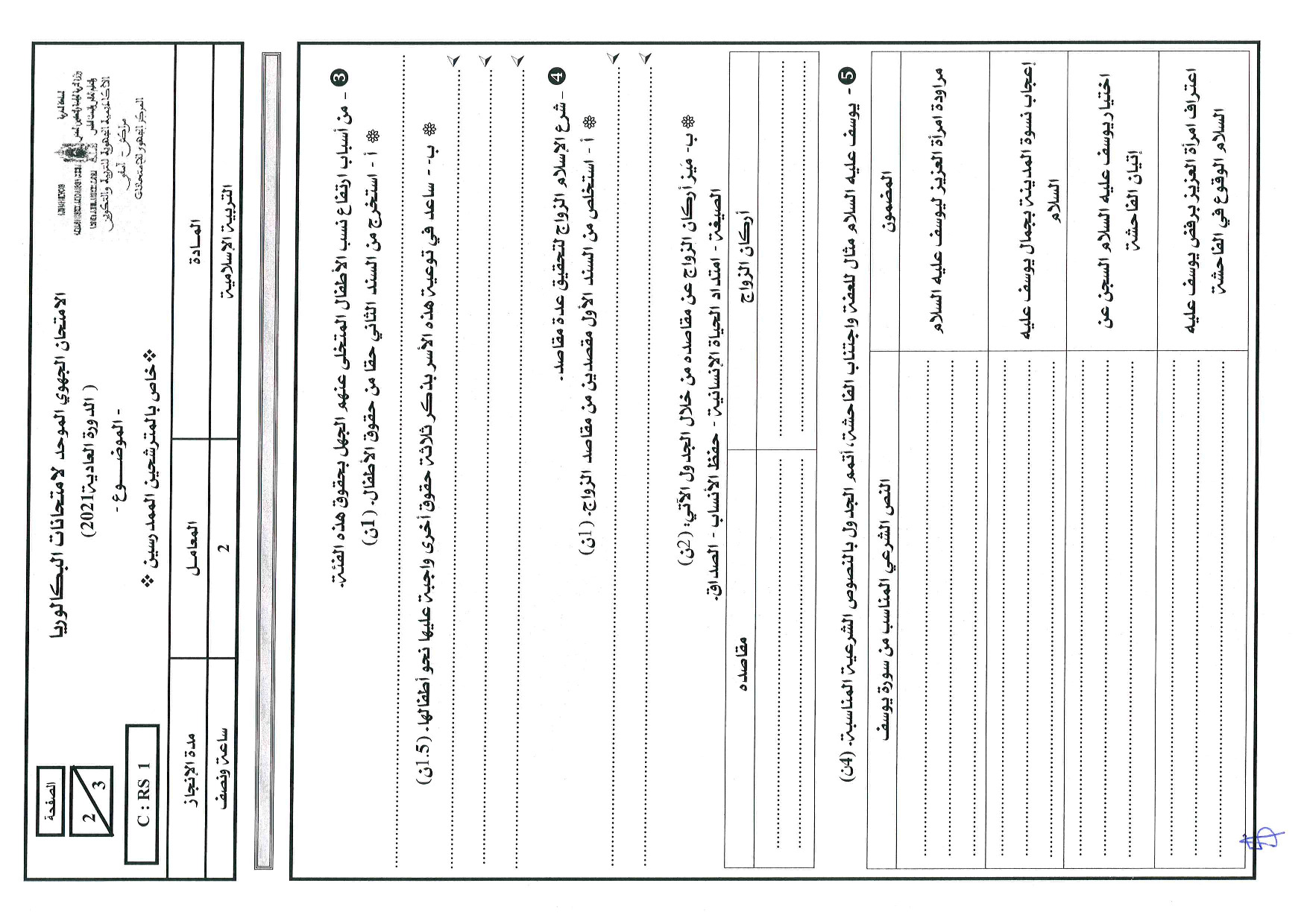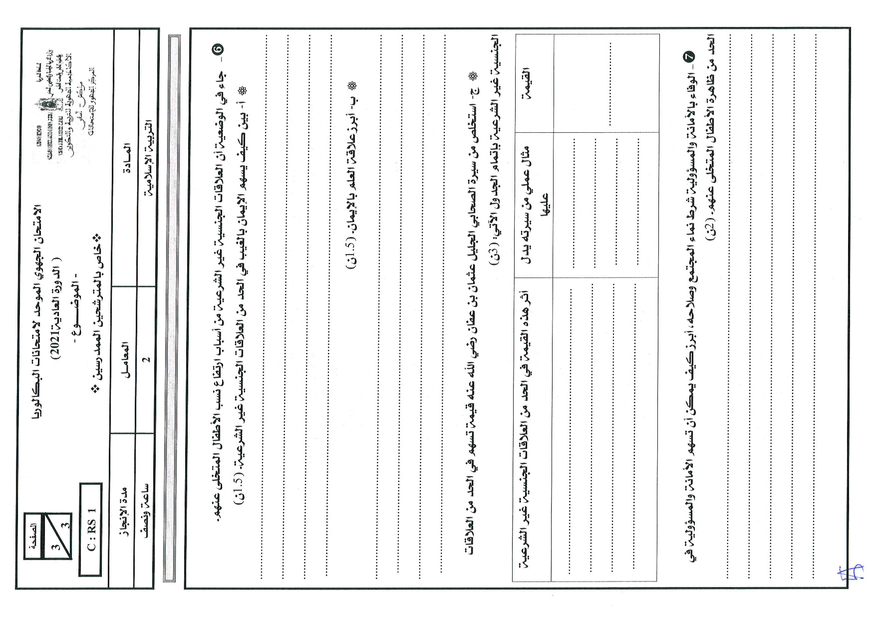 الامتحان الجهوي في التربية الإسلامية (د. العادية) - مراكش آسفي 2021 - التصحيح