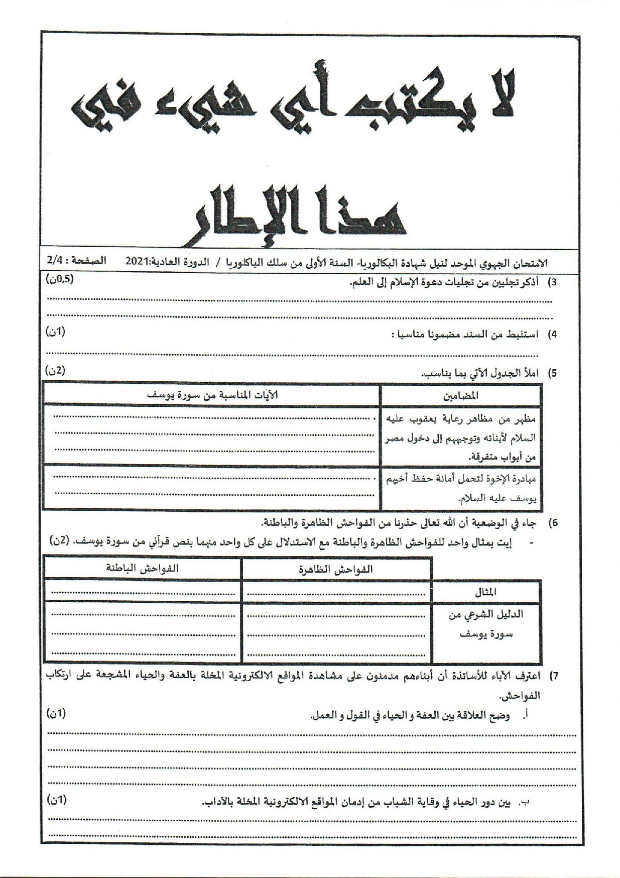 الامتحان الجهوي في التربية الإسلامية (د. العادية) - كلميم واد نون 2021 - الموضوع