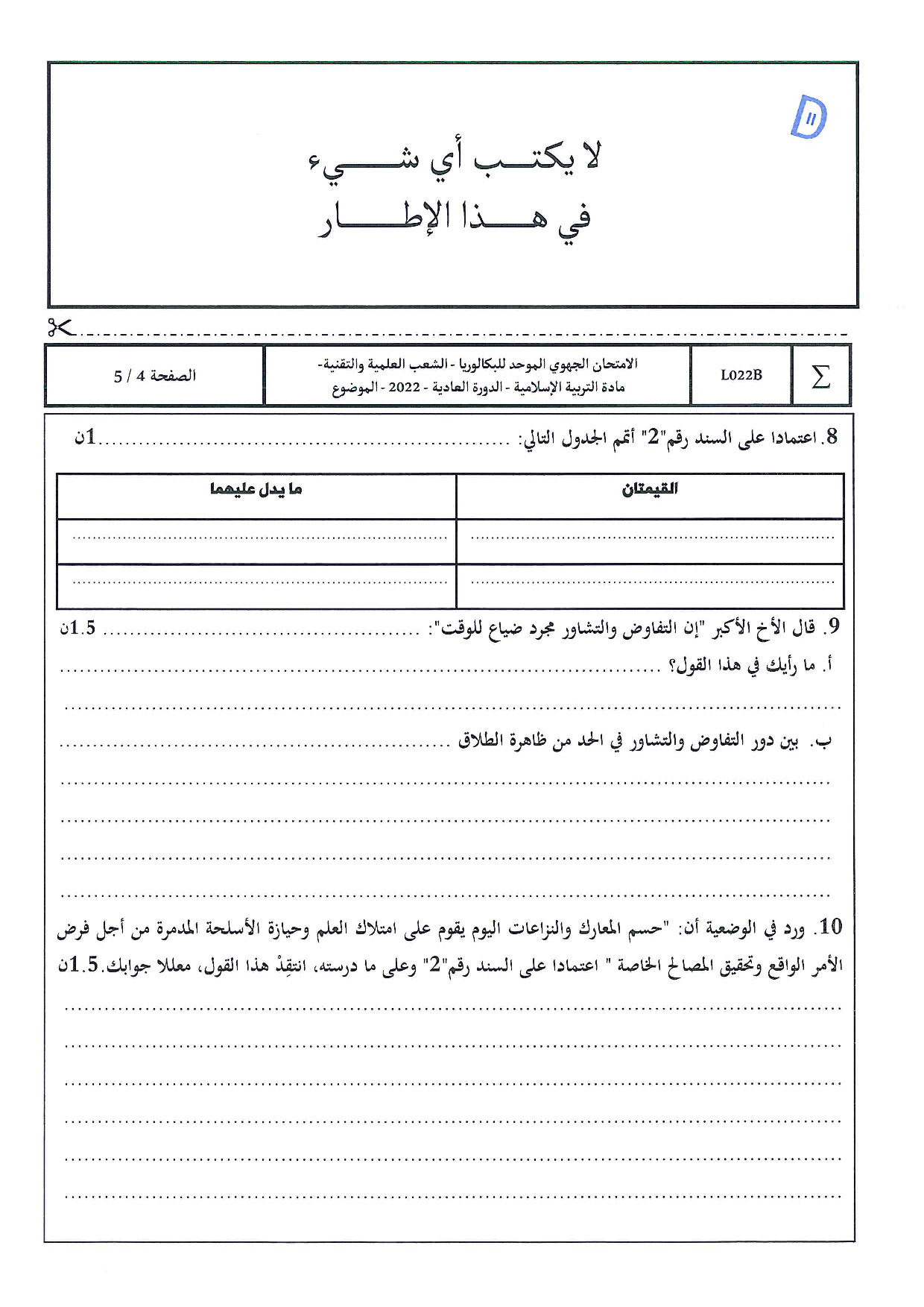 الامتحان الجهوي في التربية الإسلامية (د. العادية) - فاس مكناس 2022 - الموضوع
