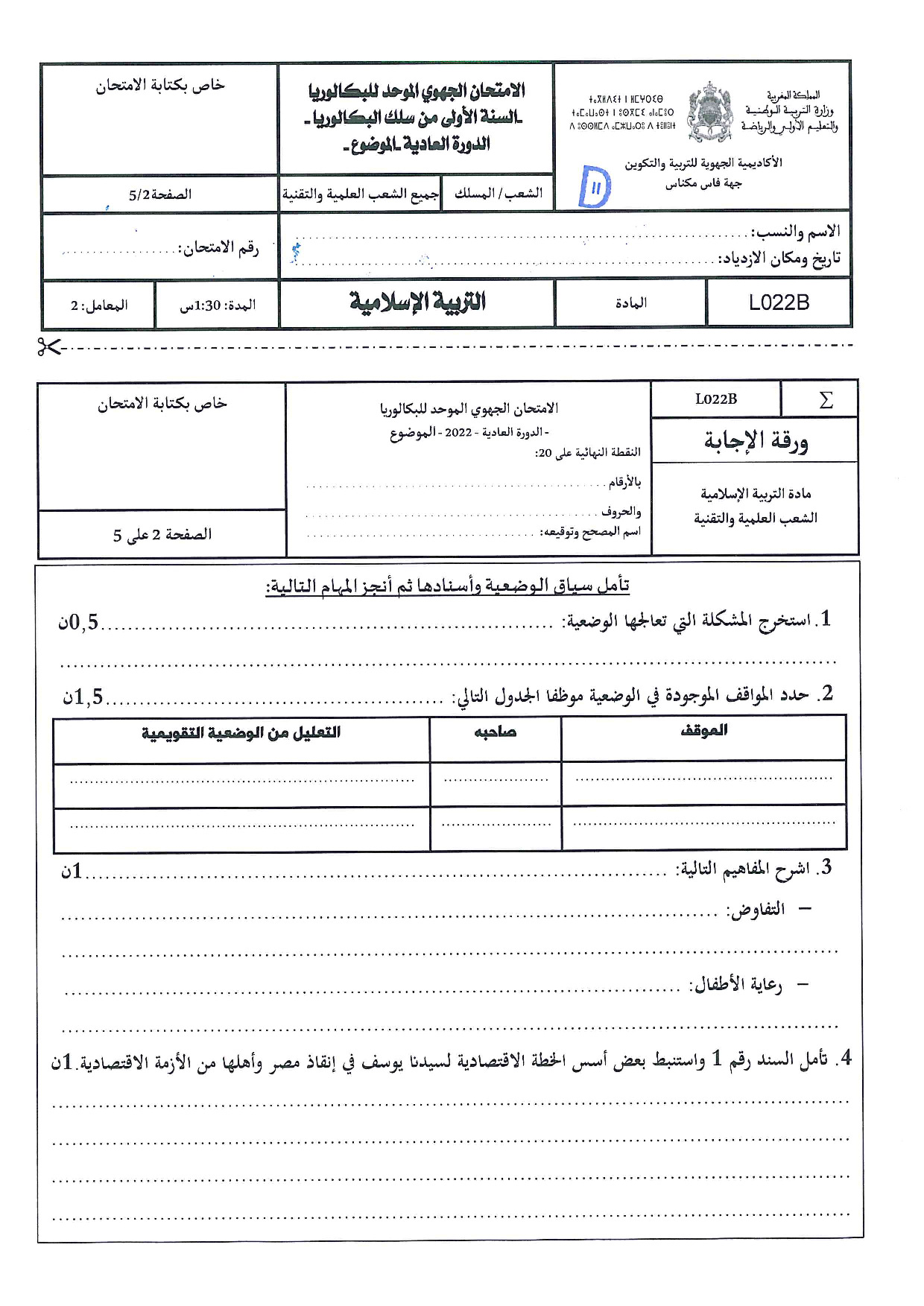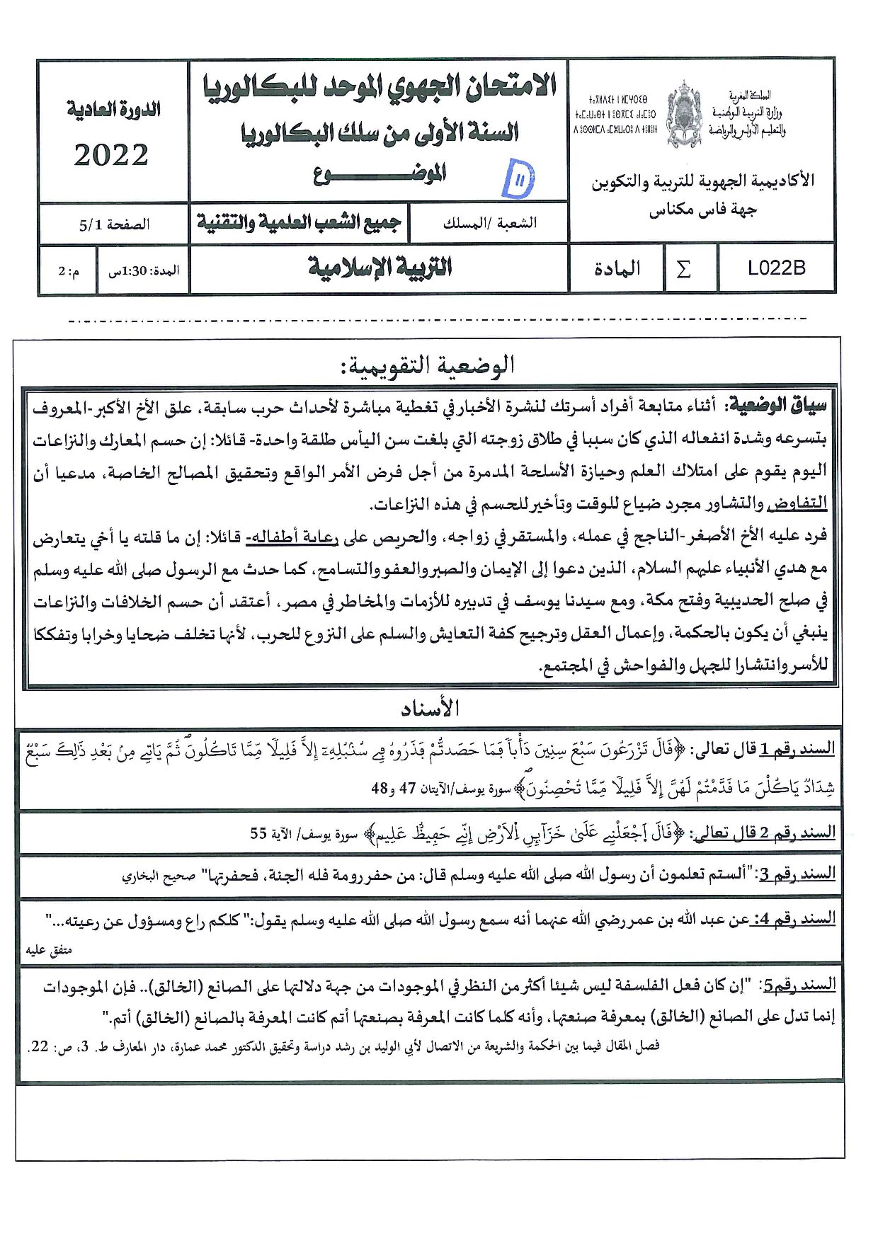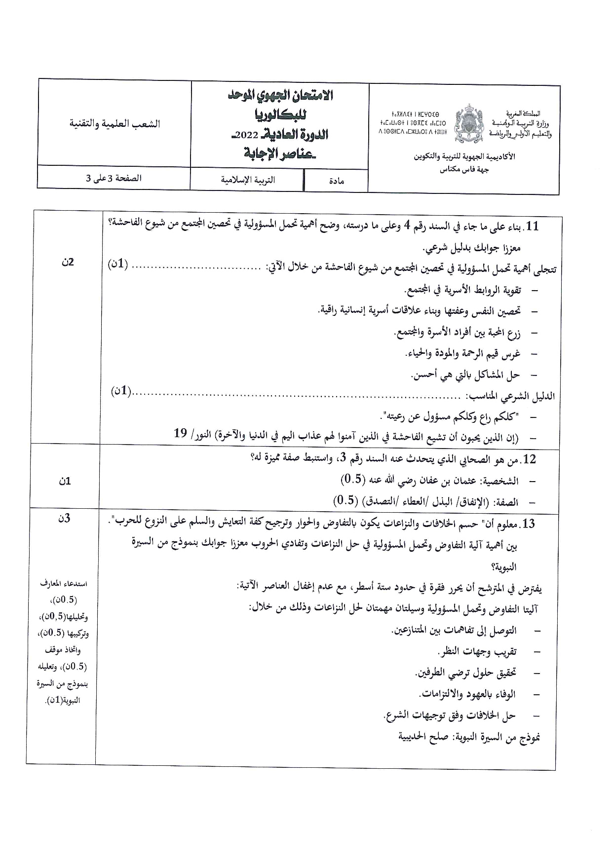 الامتحان الجهوي في التربية الإسلامية (د. العادية) - فاس مكناس 2022 - التصحيح
