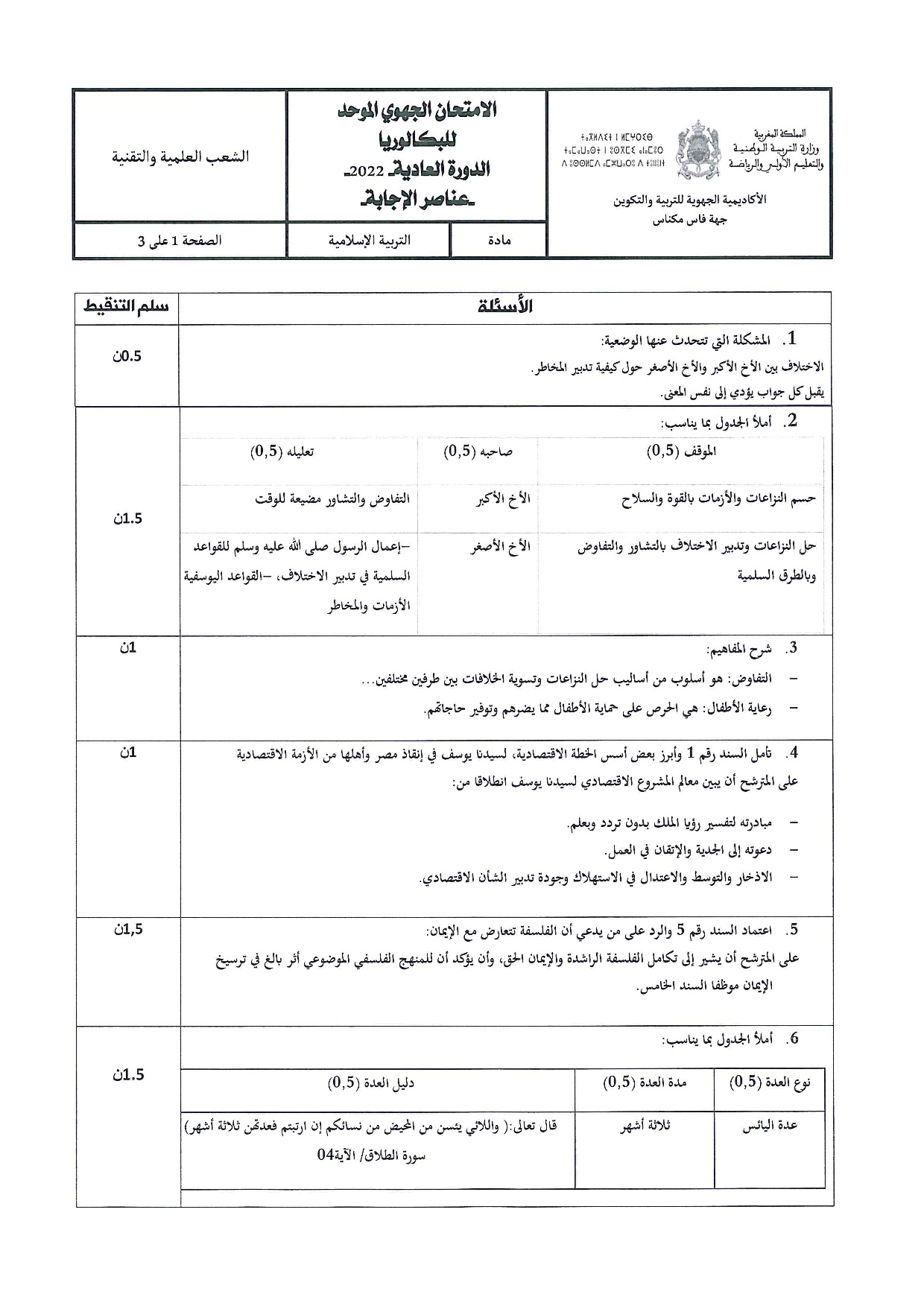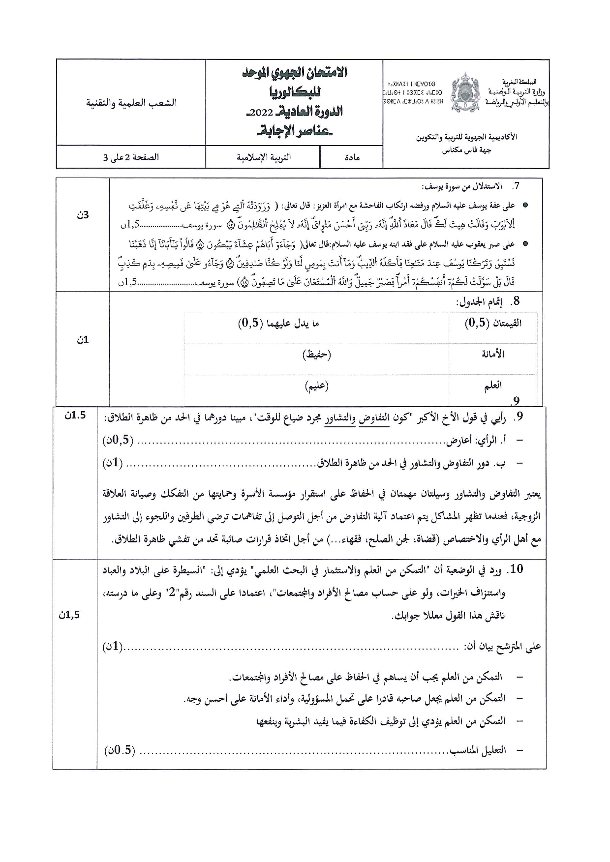 الامتحان الجهوي في التربية الإسلامية (د. العادية) - فاس مكناس 2022 - التصحيح