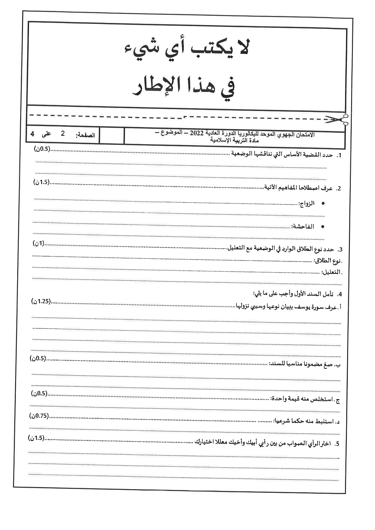 الامتحان الجهوي في التربية الإسلامية (د. العادية) - درعة تافيلالت 2022 - الموضوع