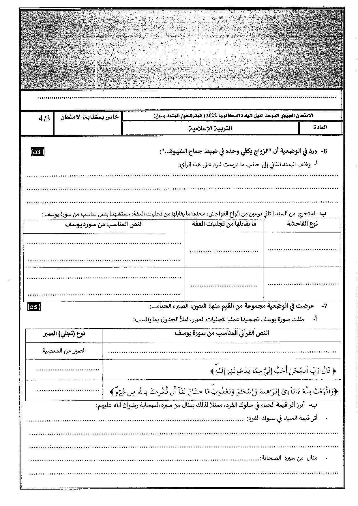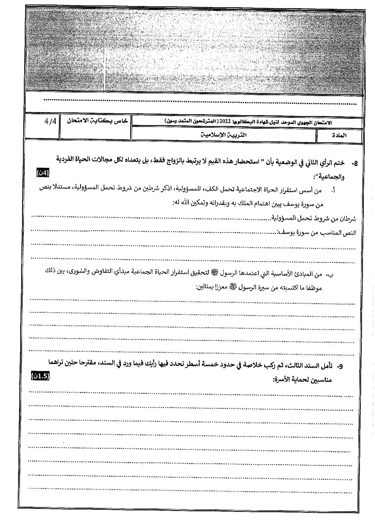 الامتحان الجهوي في التربية الإسلامية (د. العادية) - الدار البيضاء سطات 2022 - الموضوع