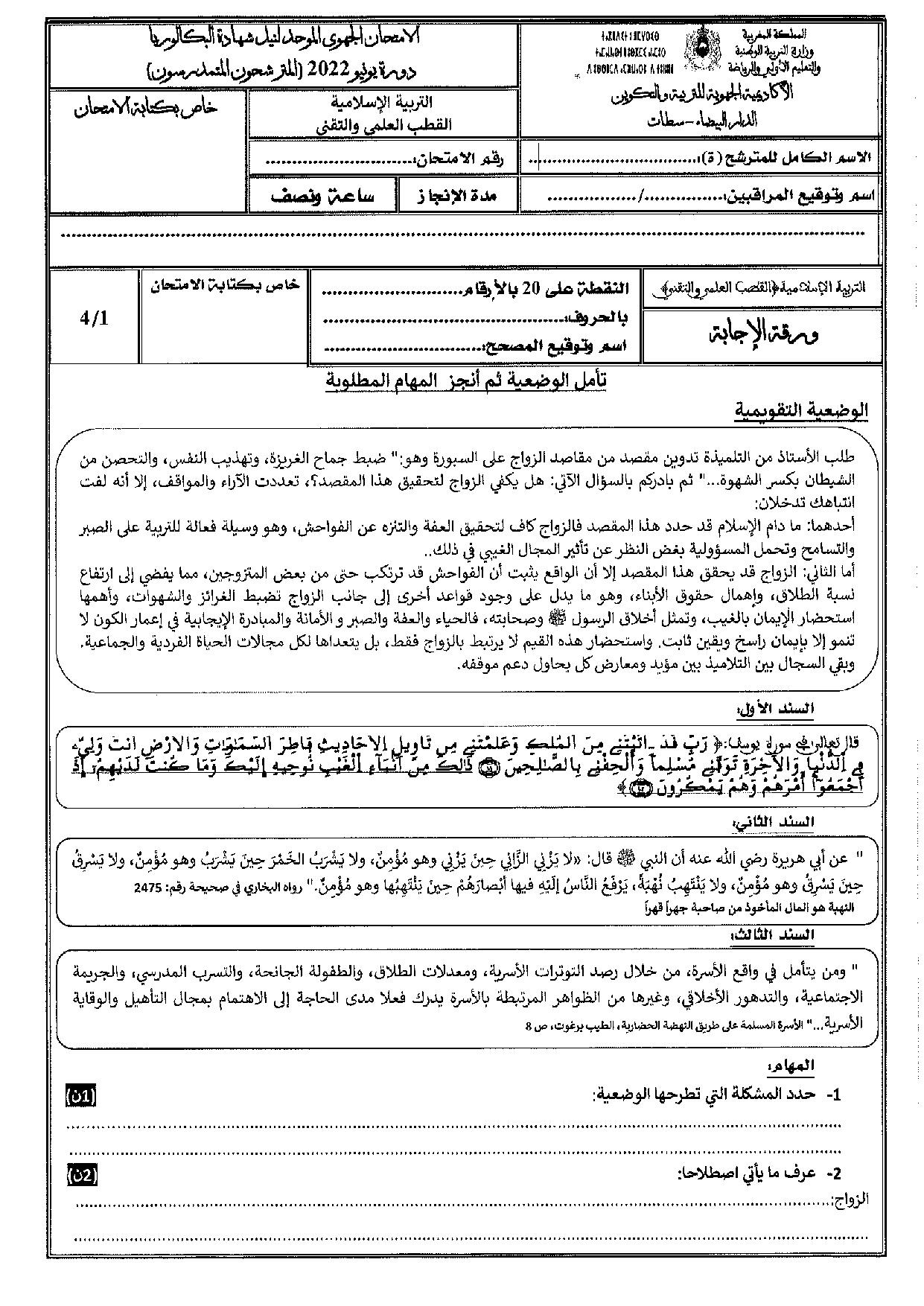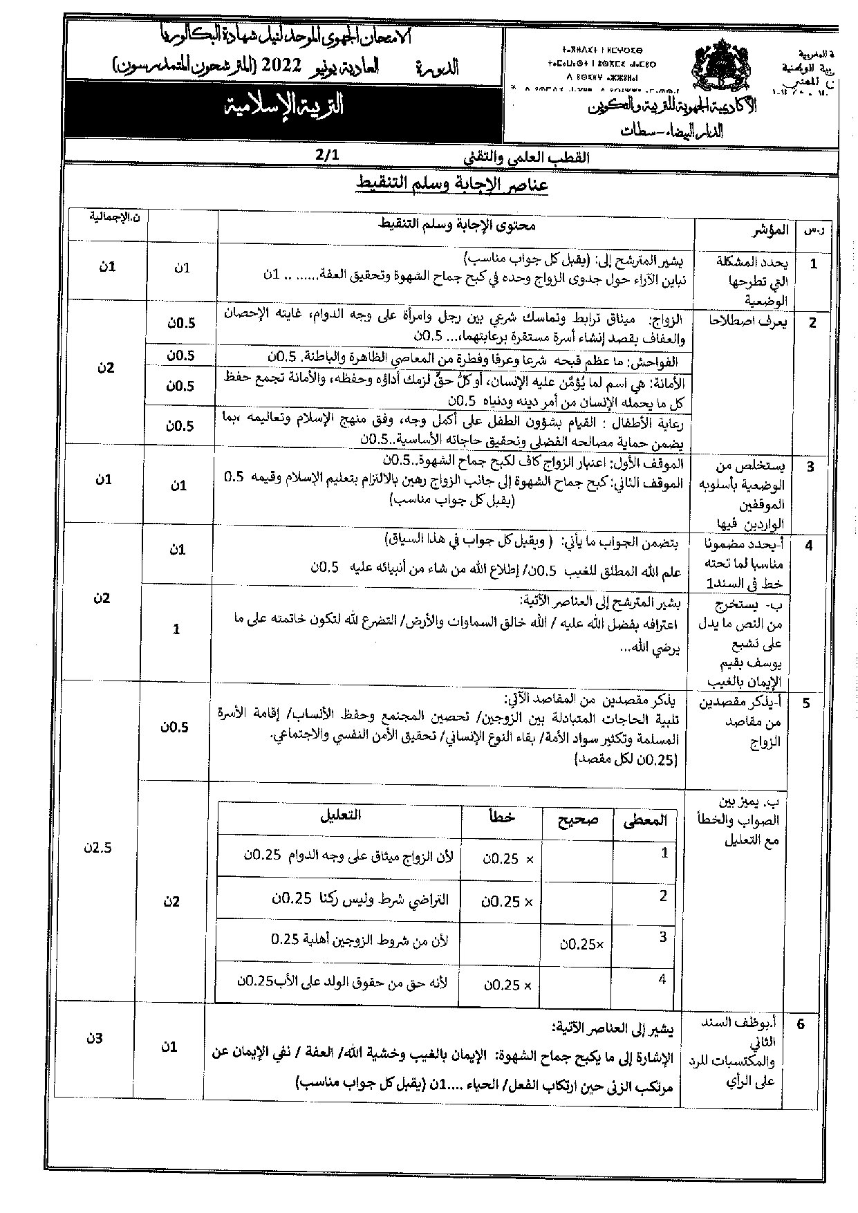 الامتحان الجهوي في التربية الإسلامية (د. العادية) - الدار البيضاء سطات 2022 - التصحيح