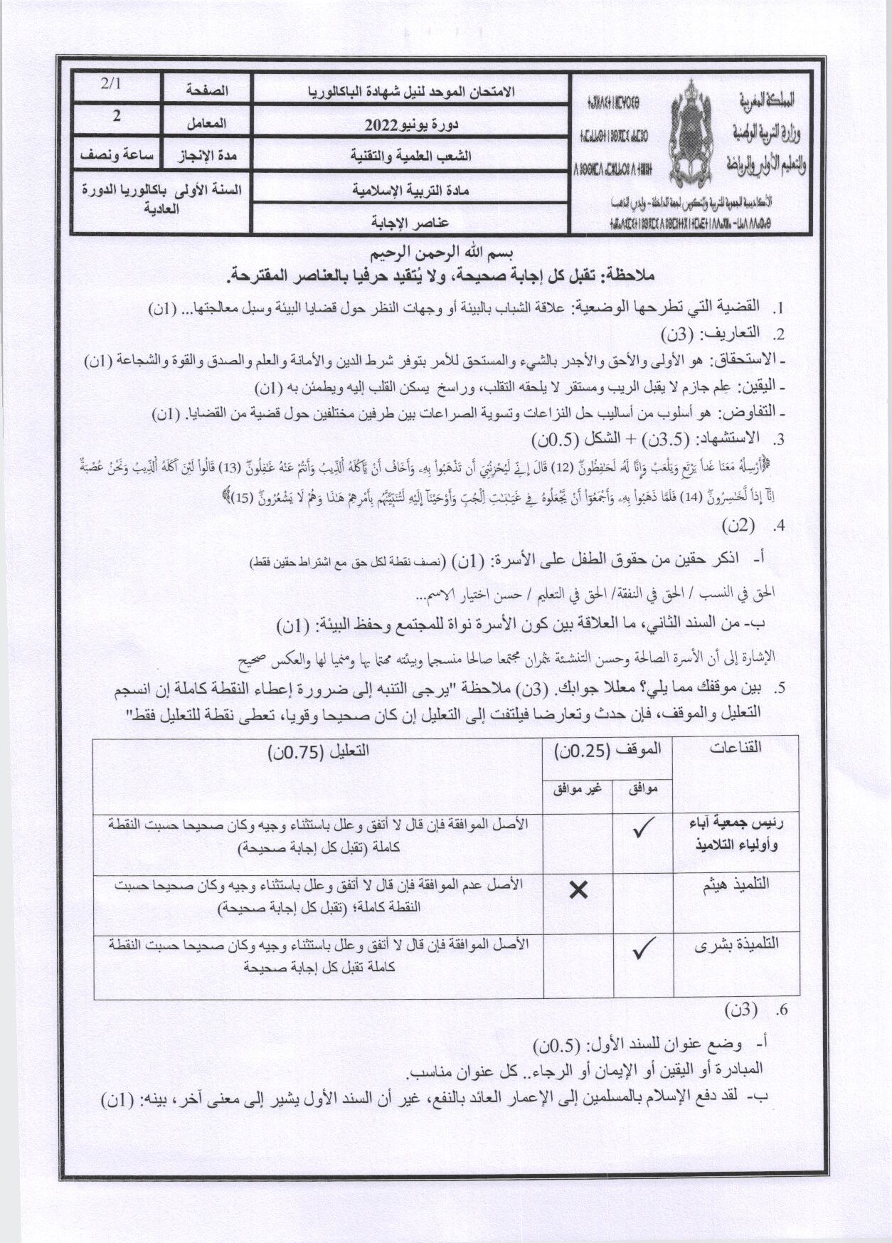 الامتحان الجهوي في التربية الإسلامية (د. العادية) - الداخلة وادي الذهب 2022 - التصحيح