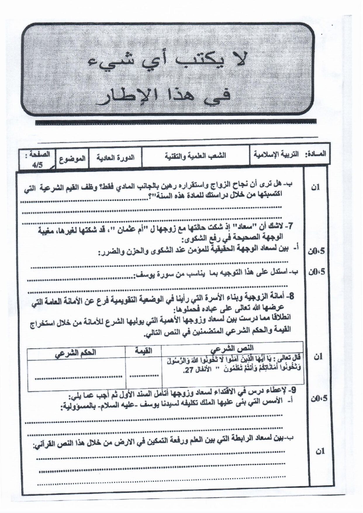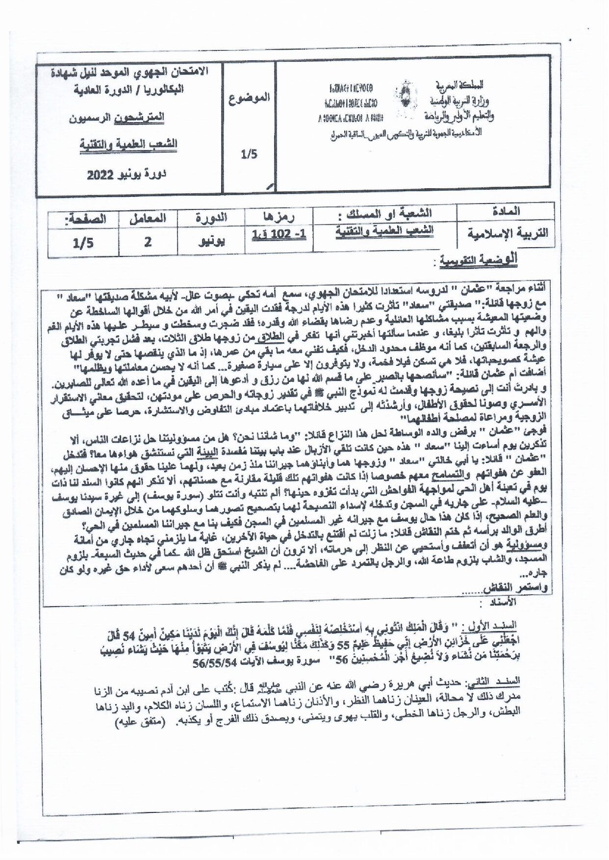 الامتحان الجهوي في التربية الإسلامية (د. العادية) - العيون الساقية الحمراء 2022 - الموضوع