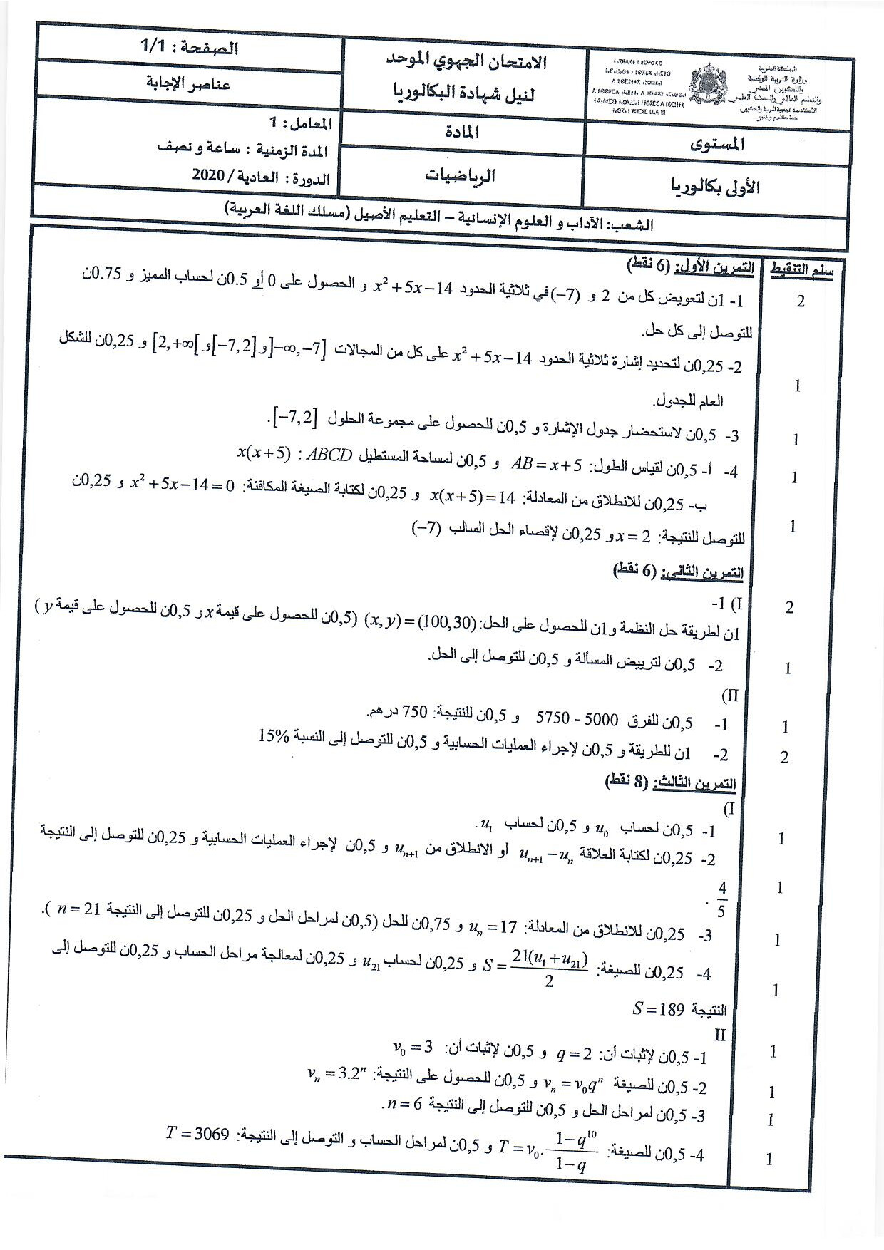 الامتحان الجهوي في الرياضيات (د. العادية) - كلميم واد نون 2020 - التصحيح