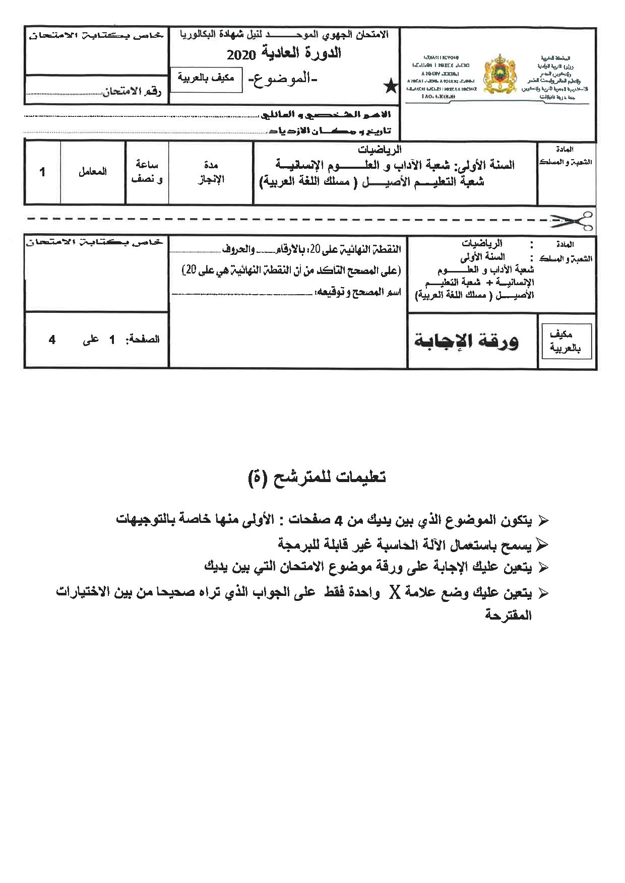 الامتحان الجهوي في الرياضيات (د. العادية) - درعة تافيلالت 2020 - الموضوع