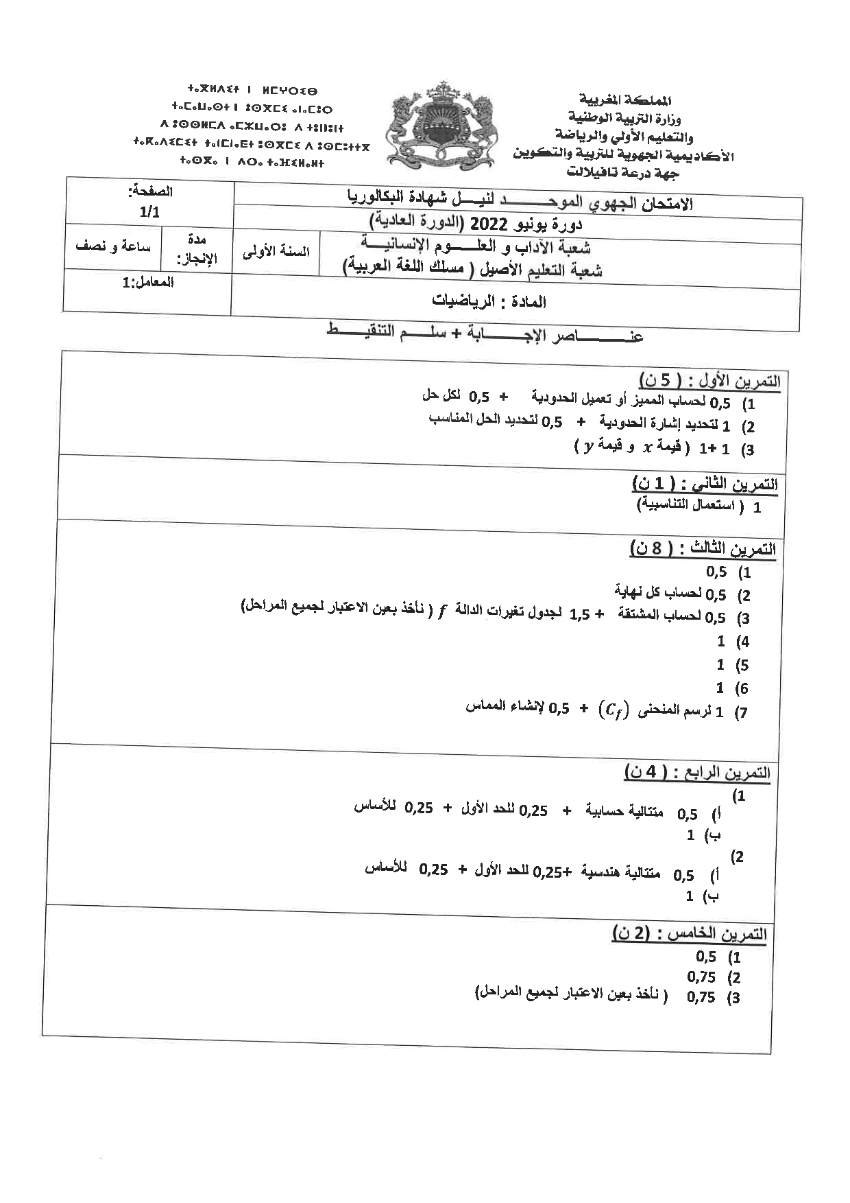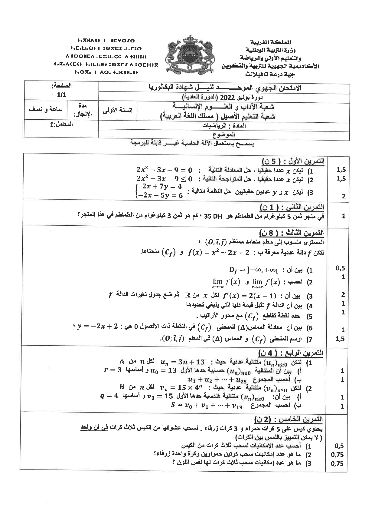 الامتحان الجهوي في الرياضيات (د. العادية) - درعة تافيلالت 2022 - الموضوع