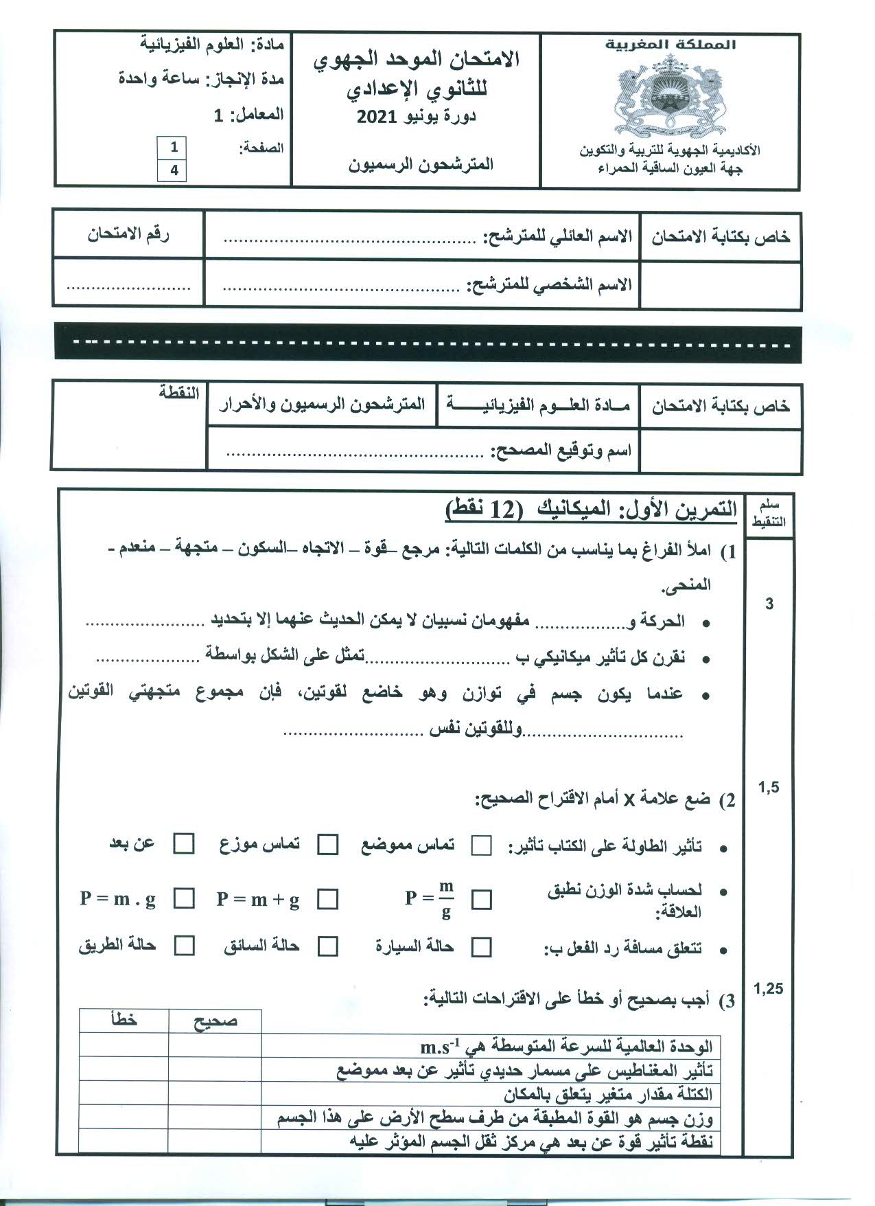 Examen régional Physique-Chimie 2021 (Laâyoune-Sakia El Hamra) - Sujet