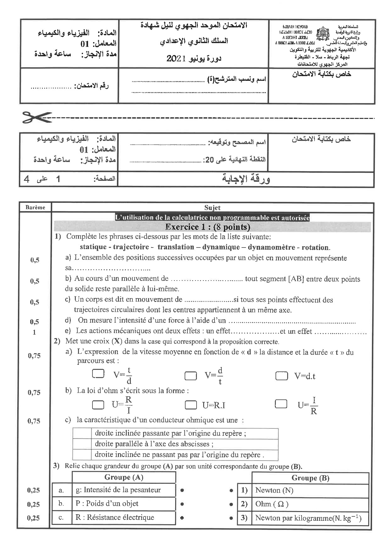 Examen régional Physique-Chimie 2021 (Rabat-Salé-Kénitra) - Sujet