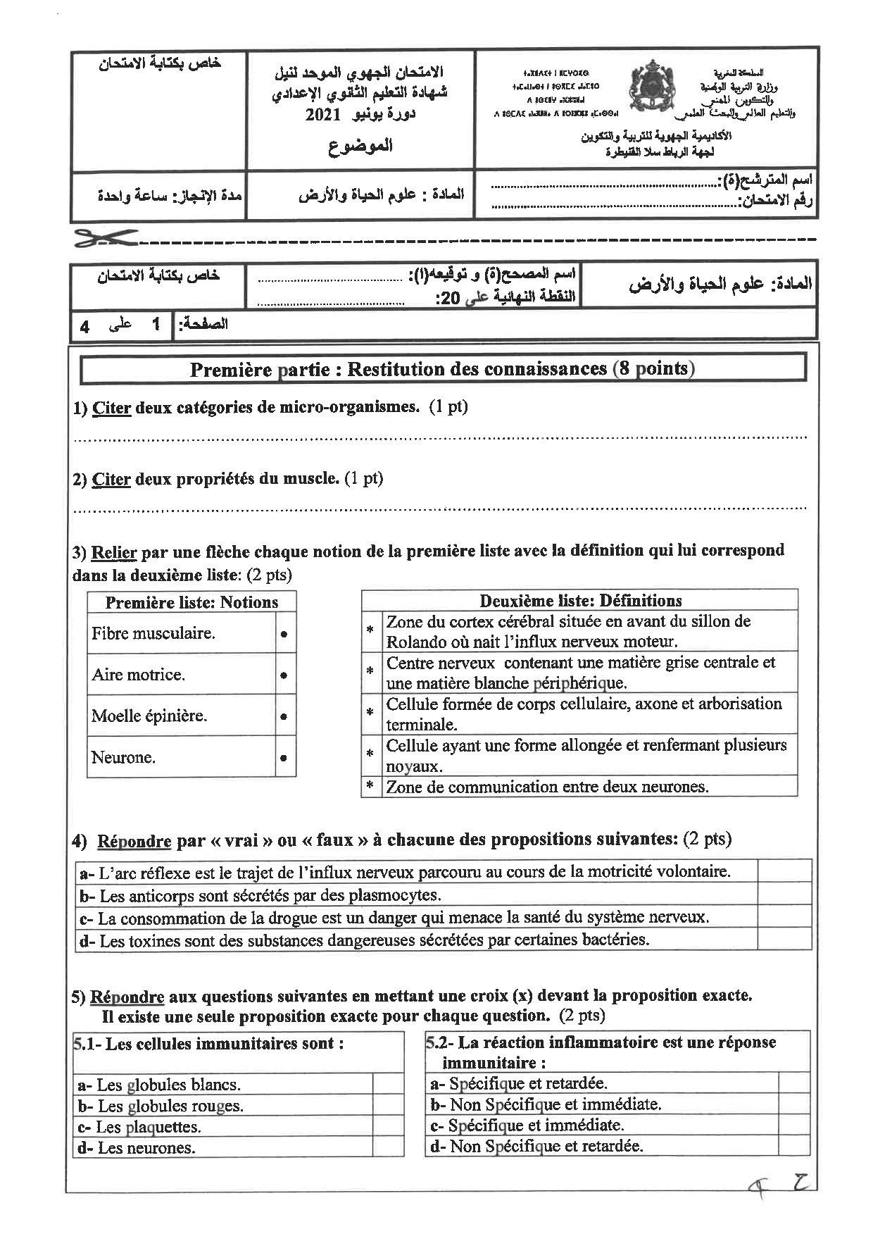 Examen régional SVT 3AC 2021 (Rabat-Salé-Kénitra) - Sujet