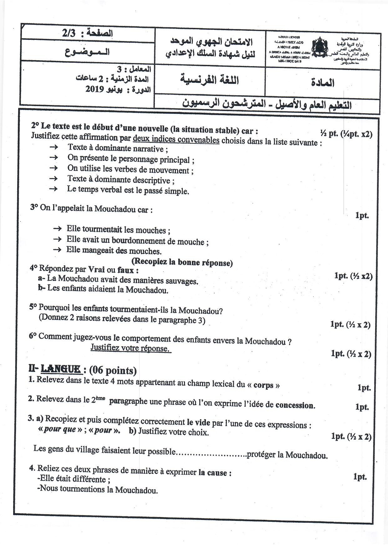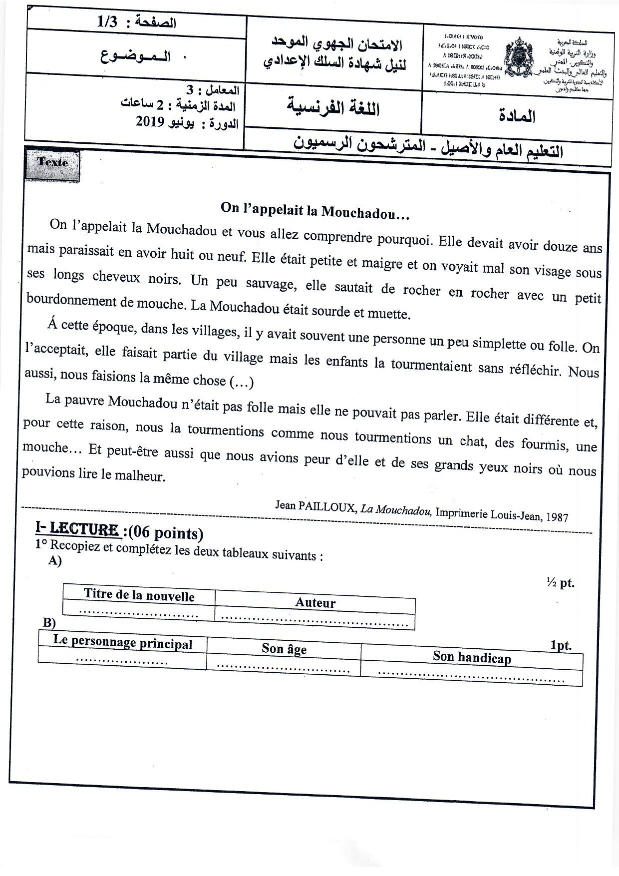 Examen régional (Français 3AC) - Guelmim-Oued Noun 2019 - Sujet
