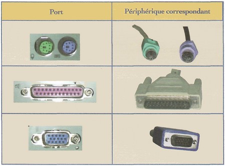 Chaque périphérique possède un connecteur ayant une forme adaptée à l'un de ces ports.