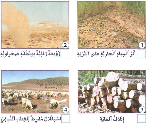 1- خلال نزهة بجوار واد، لاحظت فاطمة بروز جذور بعض الأشجار إلى السطح في بعض المناطق بجانب الوادي. فبينت لها أمها أن السبب في ذلك هو تدهور التربة.