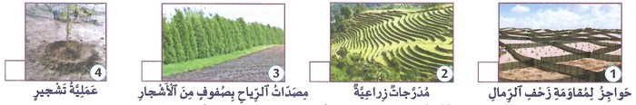 1- أحدد دور كل تقنية من التقنيات الأربع في حماية التربة بكتابة الحروف في المكان المناسب :