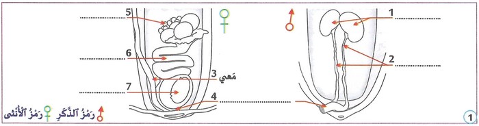 1- ألاحظ رسم جهازي توالد دجاجة وديك بعد تشريحهما :