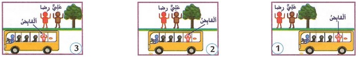 تعبر الصور الثلاثة التالية عن مراحل مرور حافلة أمام طفلين واقفين جنبا إلى جنب على الرصيف. ينتقل القابض داخل الحافلة ليستخلص ثمن الرحلة من الركاب الجالسين على المقاعد :