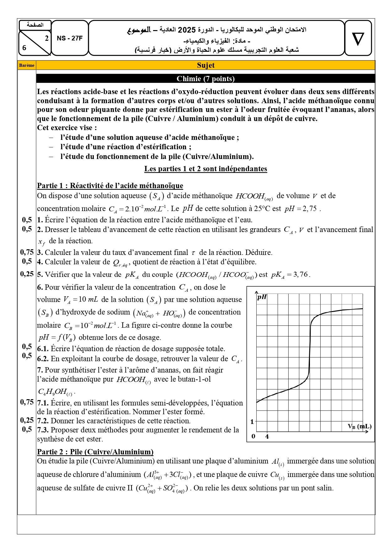 Examen National Physique-Chimie 2 Bac SVT 2025 Normale - Sujet