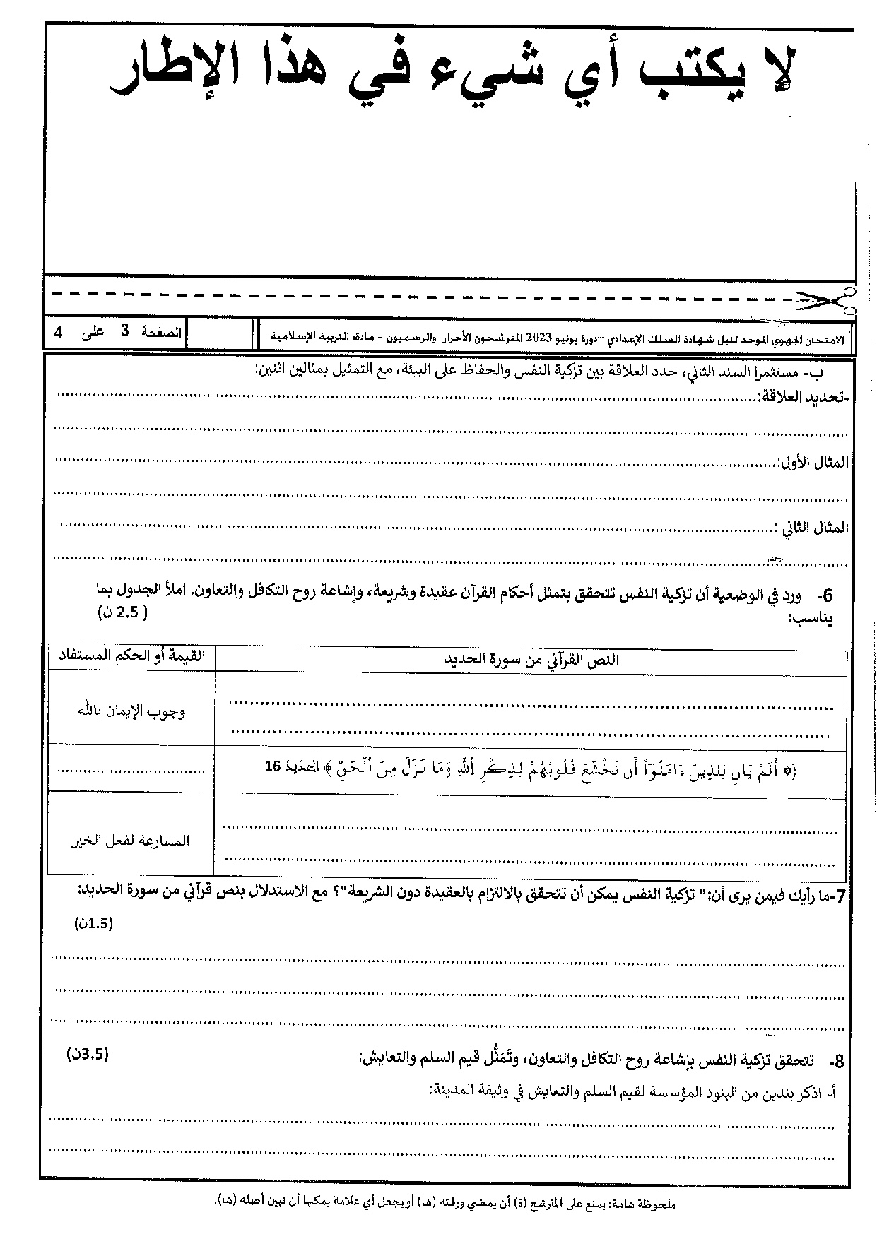 الامتحان الجهوي للثالثة إعدادي (التربية الإسلامية) - الدار البيضاء سطات 2023 - الموضوع