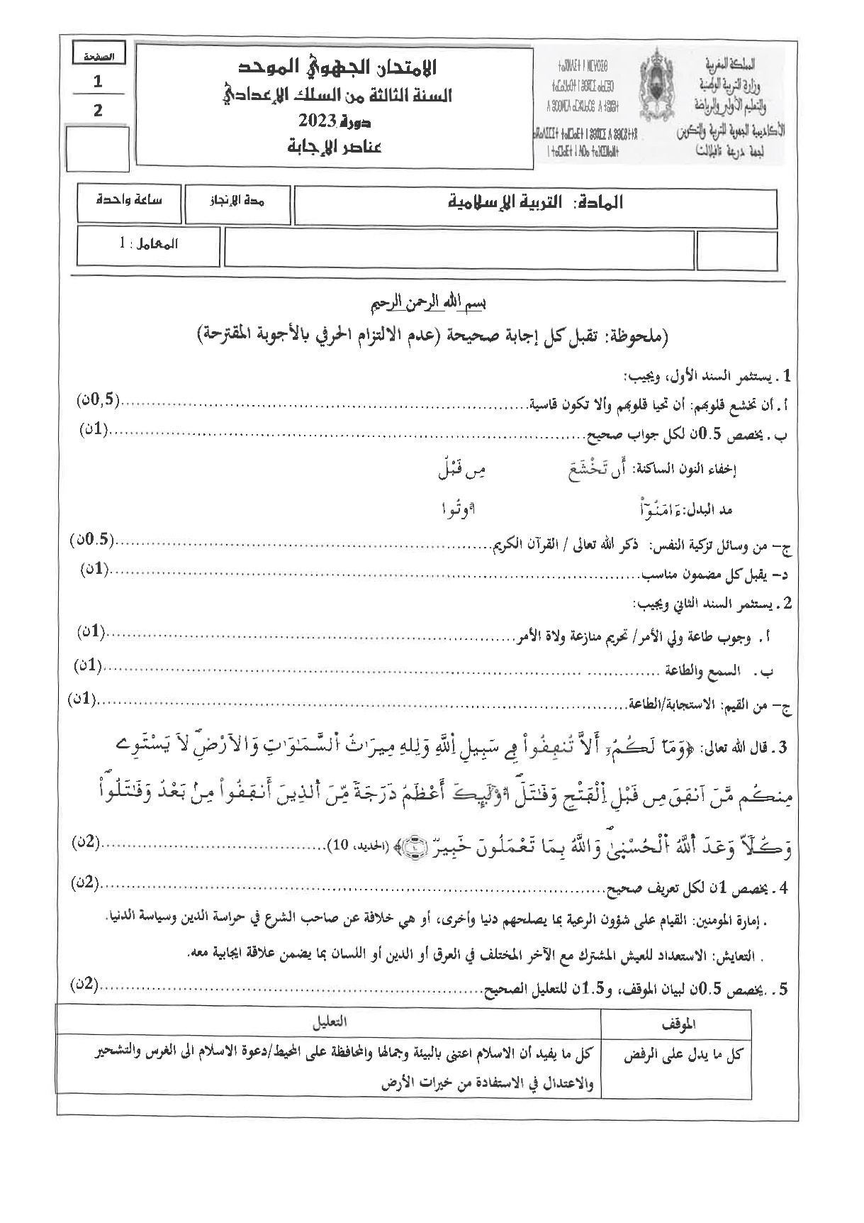 الامتحان الجهوي للثالثة إعدادي (التربية الإسلامية) - درعة تافيلالت 2023 - التصحيح