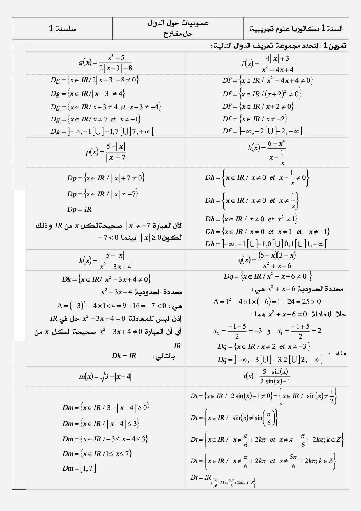 عموميات حول الدوال العددية - تصحيح سلسلة التمارين 1