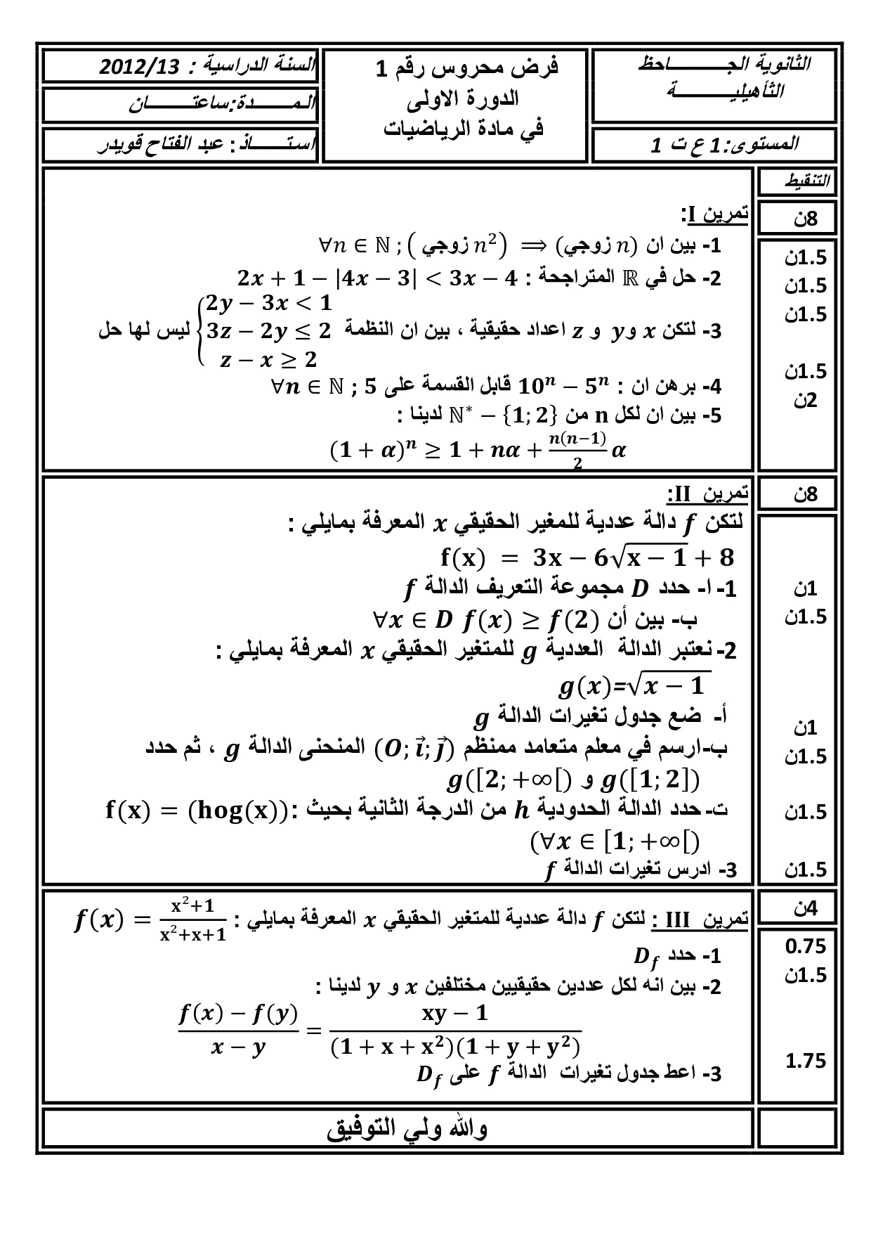 الفرض 1 نموذج 12 - الرياضيات أولى باك علوم تجريبية الدورة الأولى