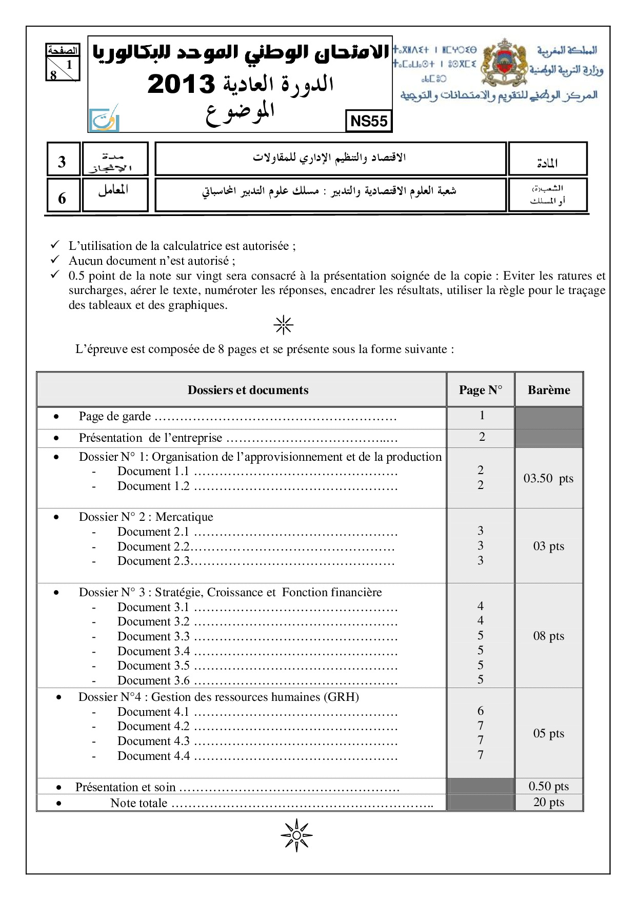 Examen EOAE 2 Bac SGC 2013 Session Normale - Sujet