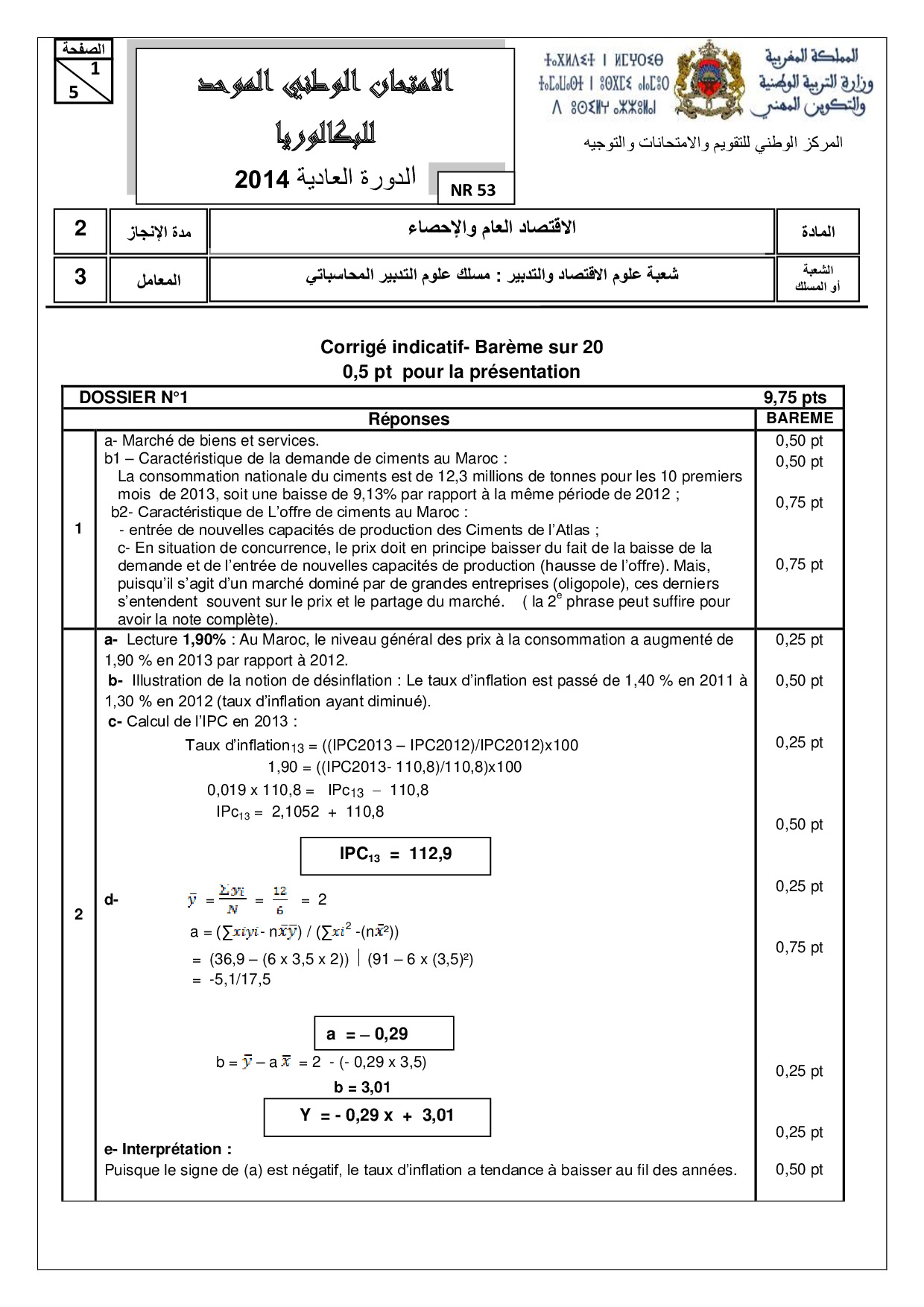 Examen Statistiques 2 Bac SGC 2014 Session Normale - Corrigé