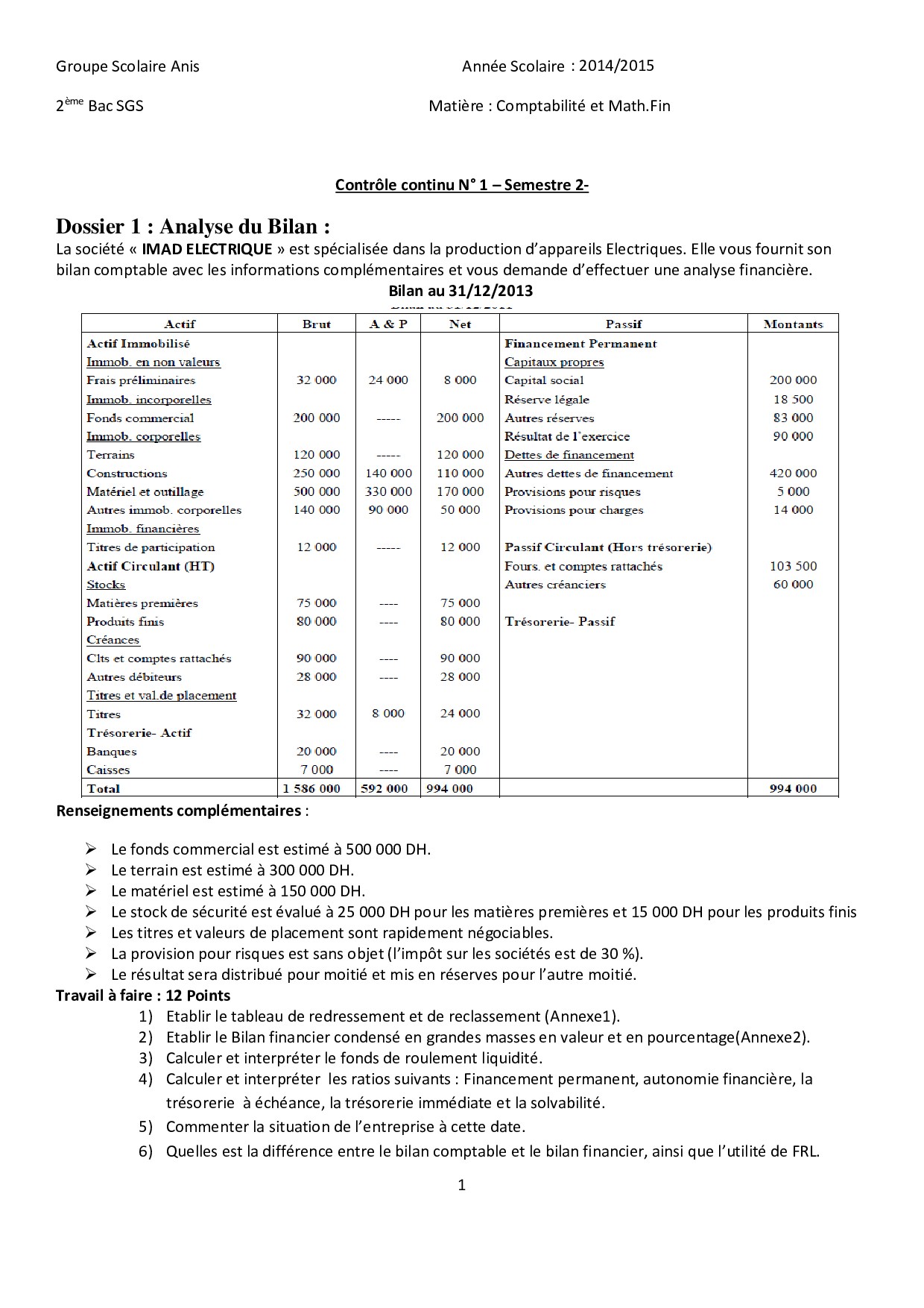 Devoir 1 Modèle 6 - Comptabilité 2 Bac SGC Semestre 2