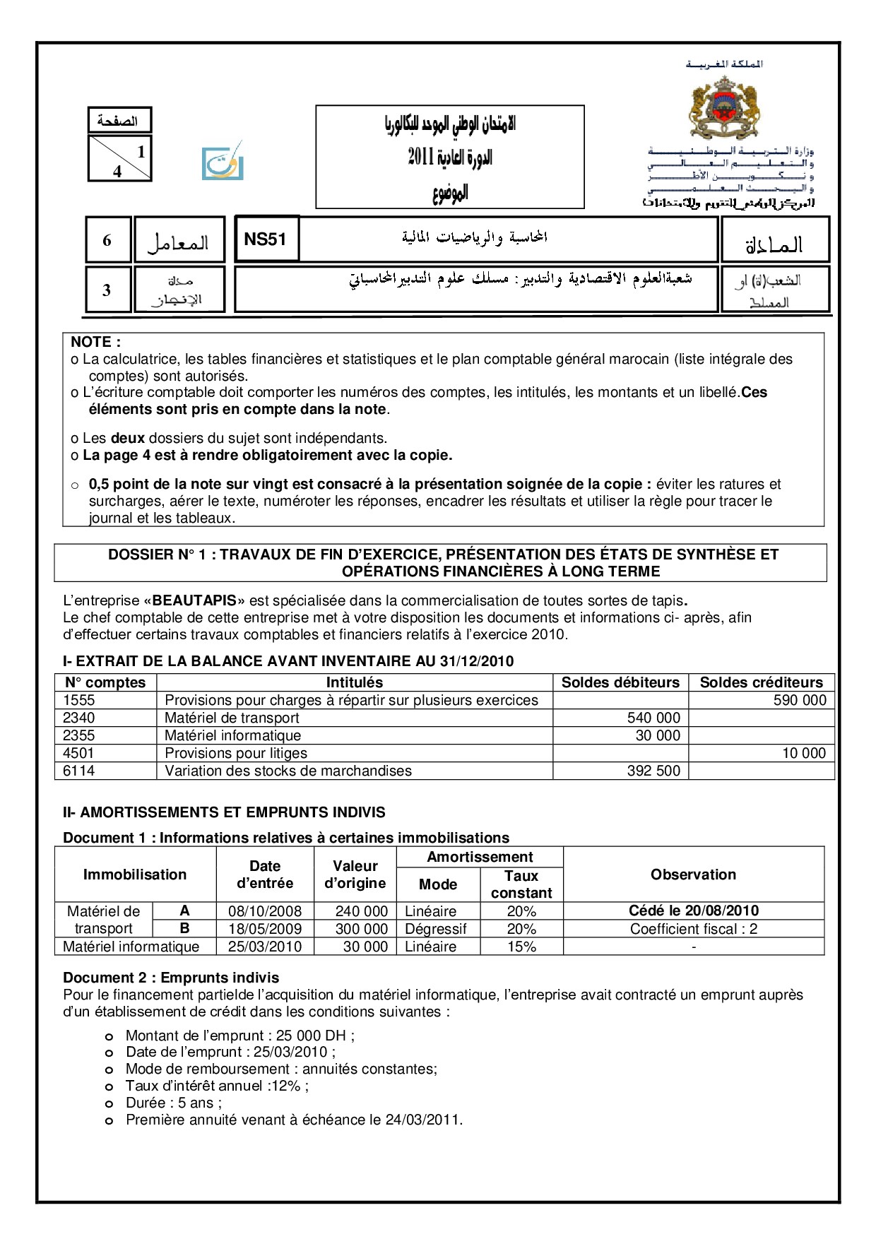 Examen Comptabilité 2 Bac SGC 2011 Session Normale - Sujet