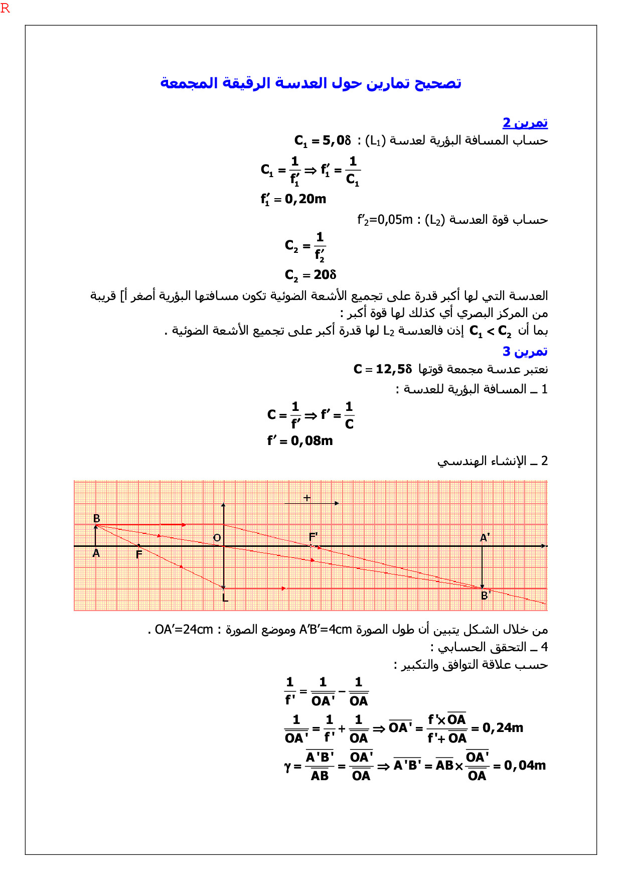 الصور المحصل عليها بواسطة عدسة رقيقة مجمعة - تصحيح سلسلة التمارين 1