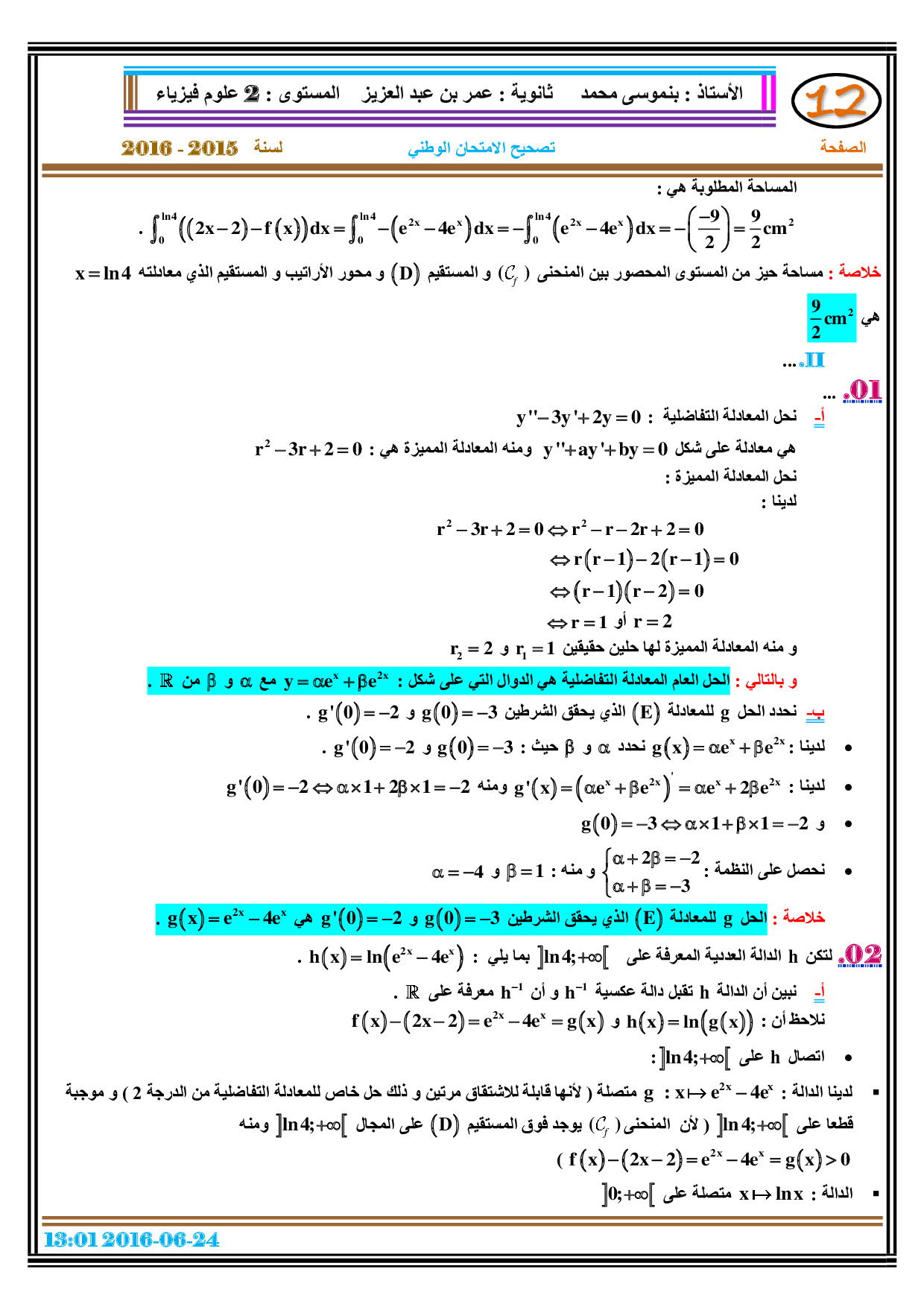 الرياضيات للشعب العلمية والتكنولوجية 2016 الدورة العادية - التصحيح