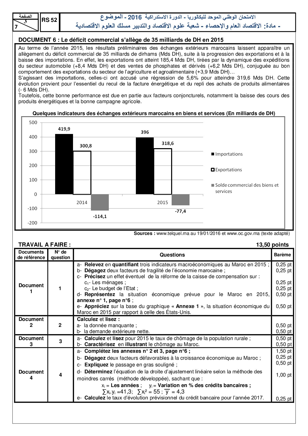 Examen Statistiques 2 Bac Eco 2016 Session Rattrapage - Sujet
