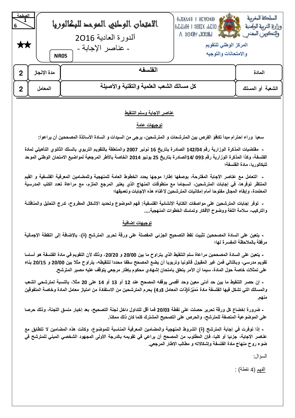 الفلسفة للشعب العلمية والتقنية 2016 الدورة العادية - التصحيح