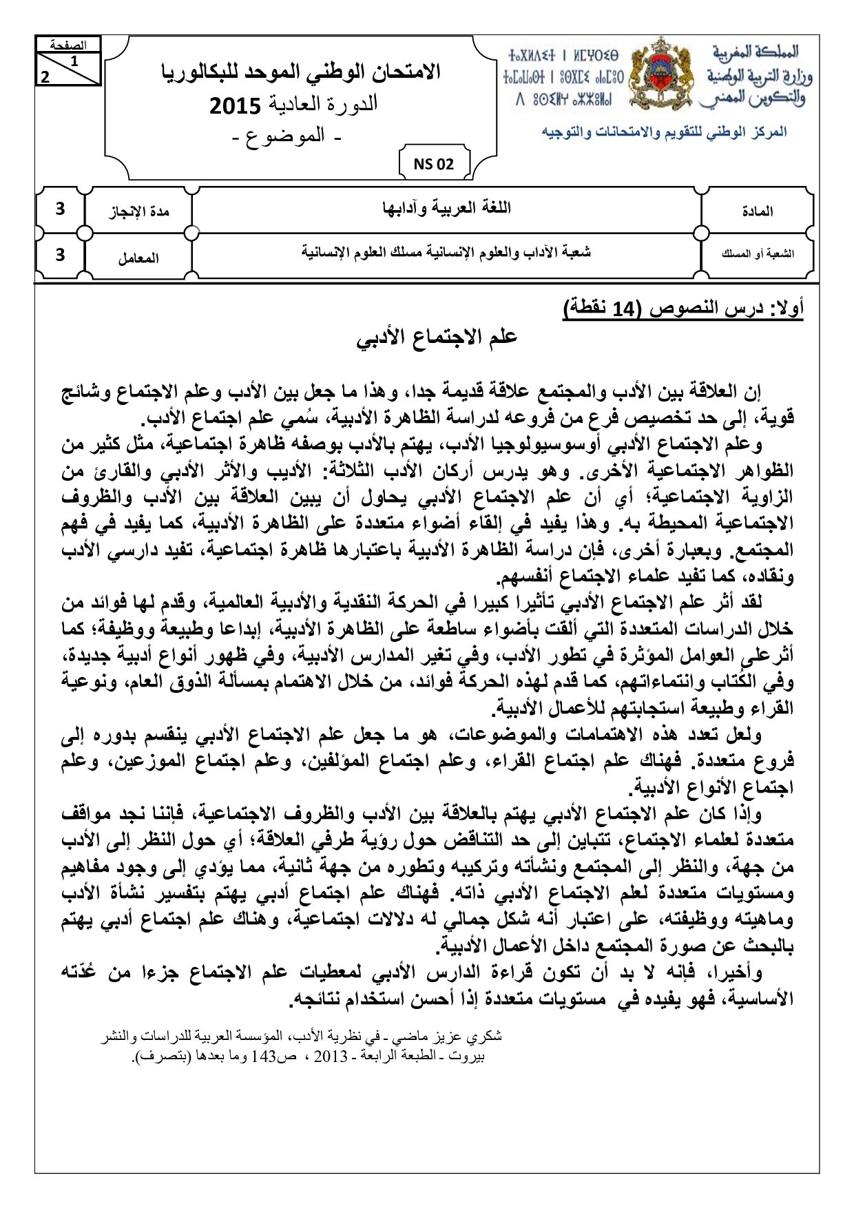 اللغة العربية (شعبة العلوم الإنسانية) 2015 الدورة العادية - الموضوع