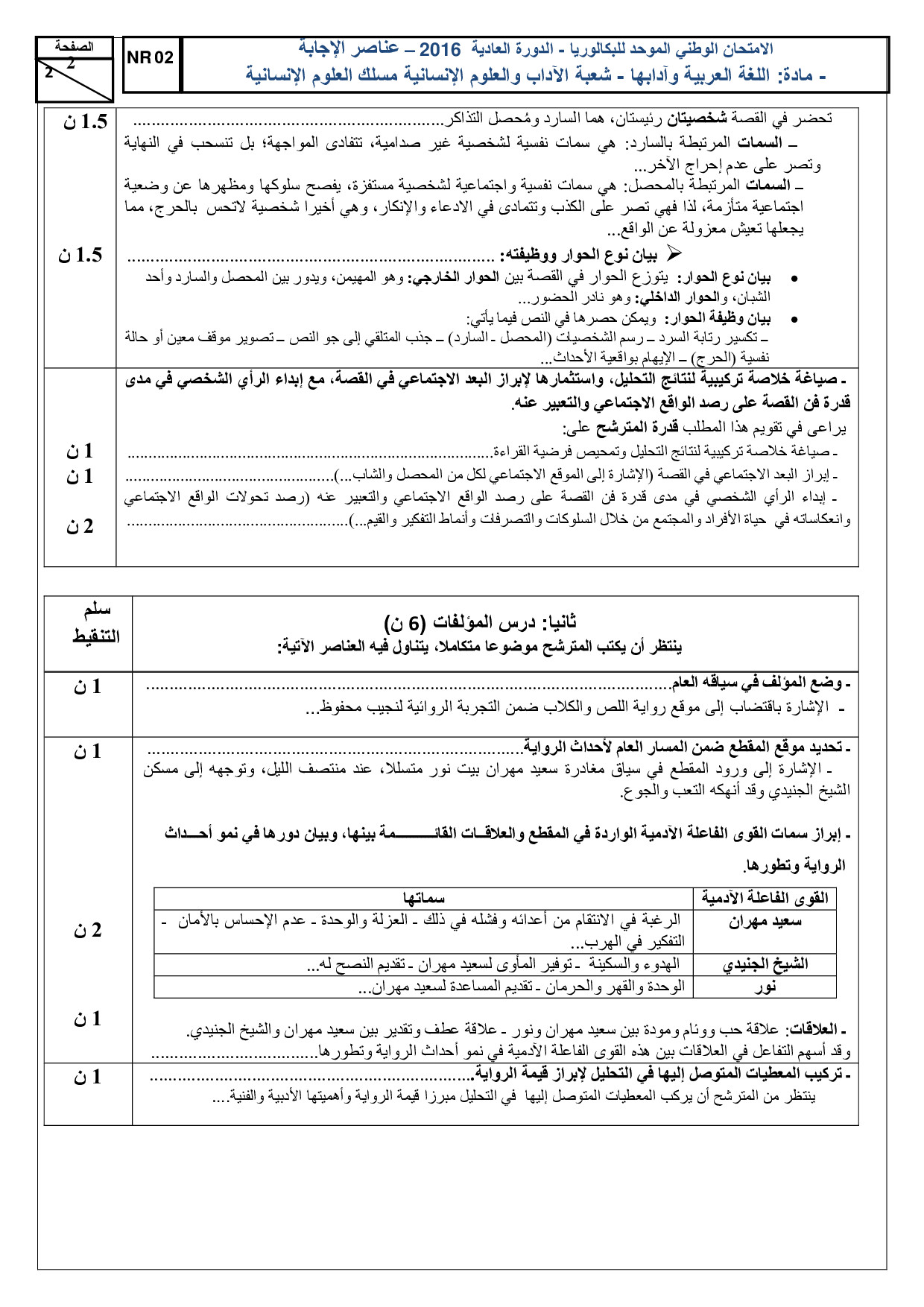 اللغة العربية (شعبة العلوم الإنسانية) 2016 الدورة العادية - التصحيح