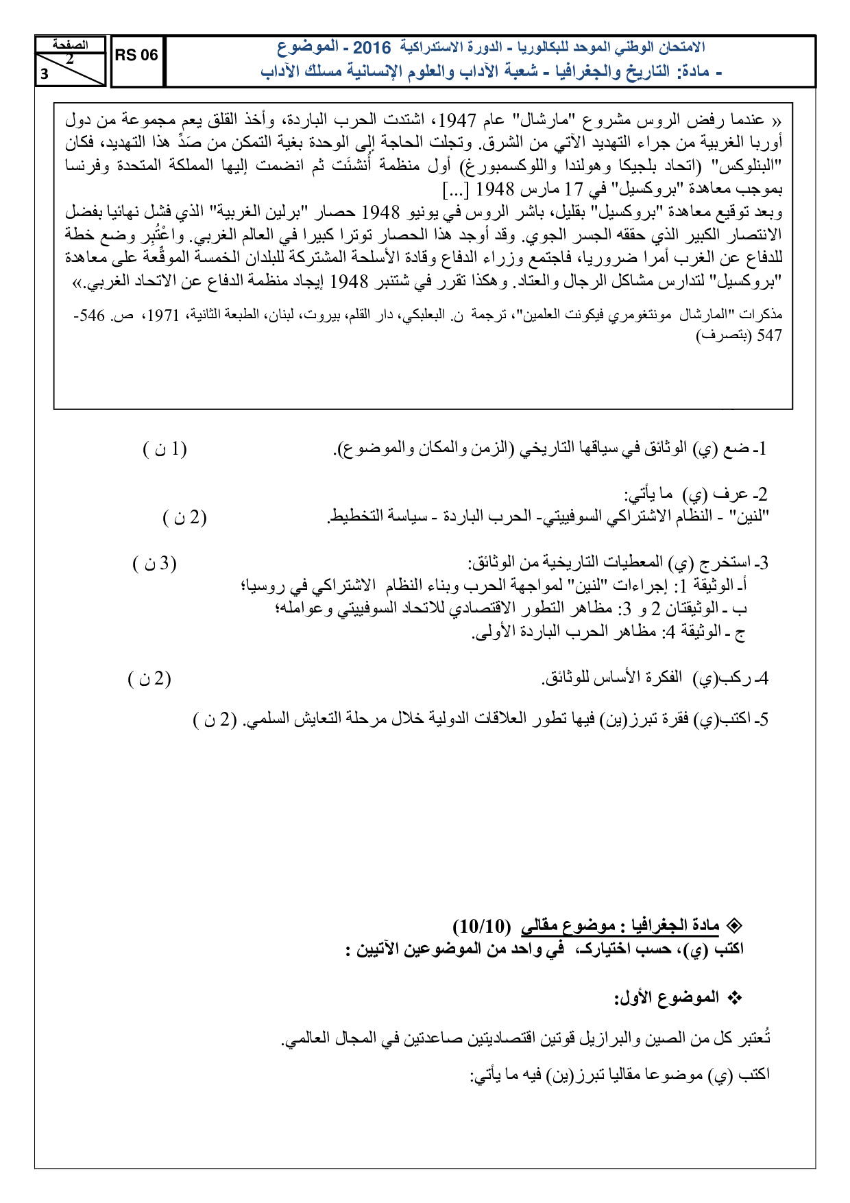 الإجتماعيات (شعبة الآداب) 2016 الدورة الإستدراكية - الموضوع