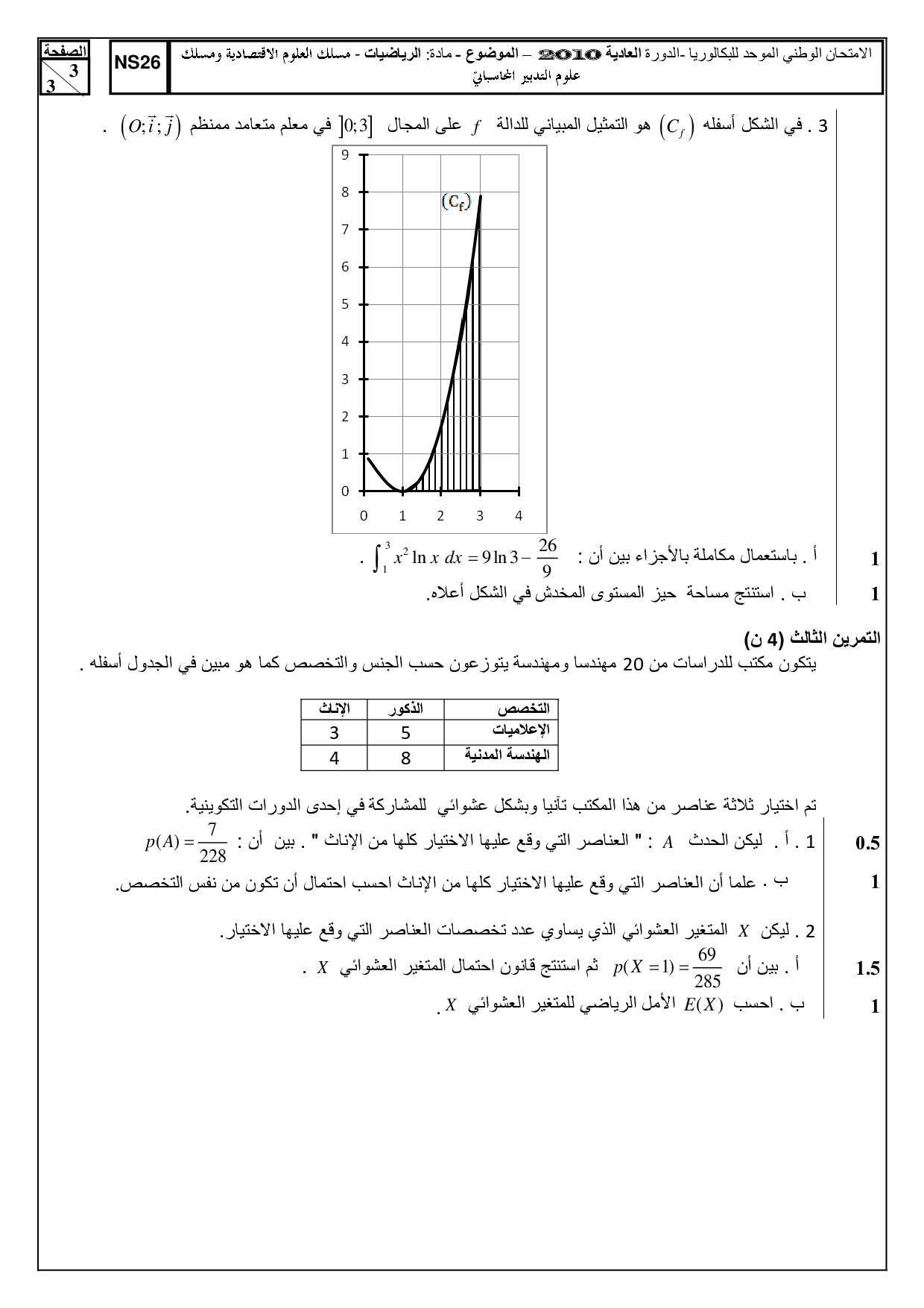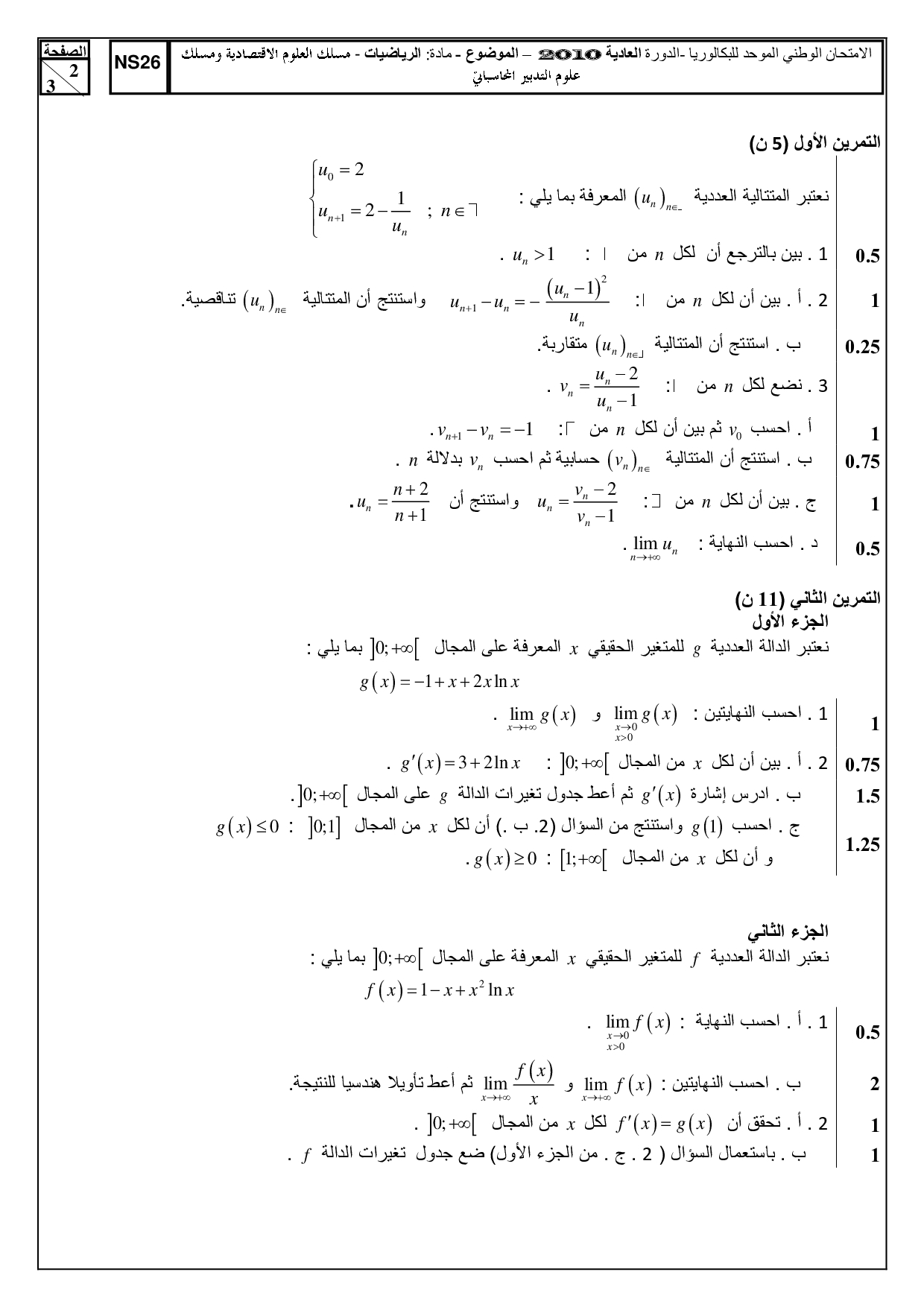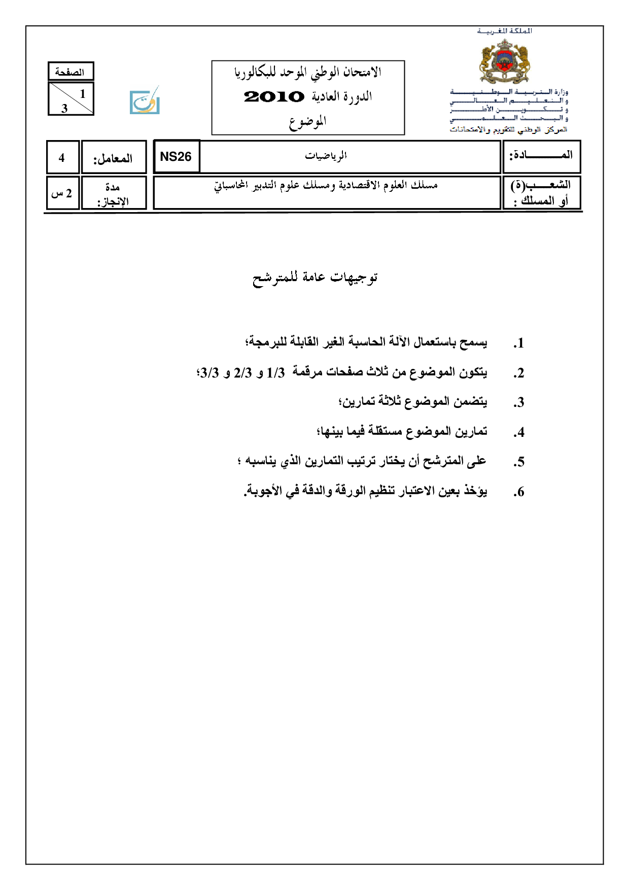 Examen National Maths 2Bac Eco-SGC 2010 Normale - Sujet (Ar)