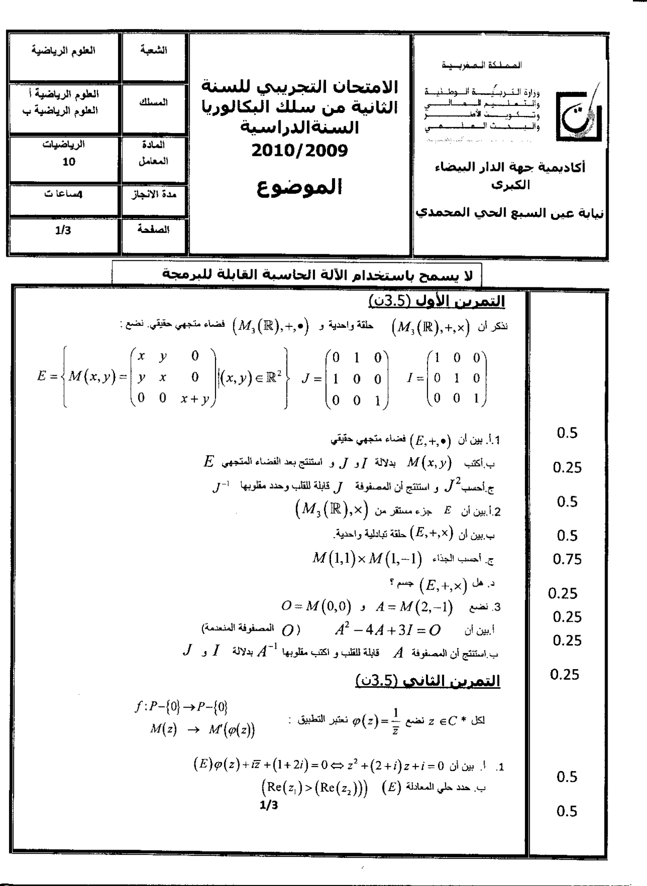 إمتحان تجريبي 3 - الرياضيات ثانية باك علوم رياضية