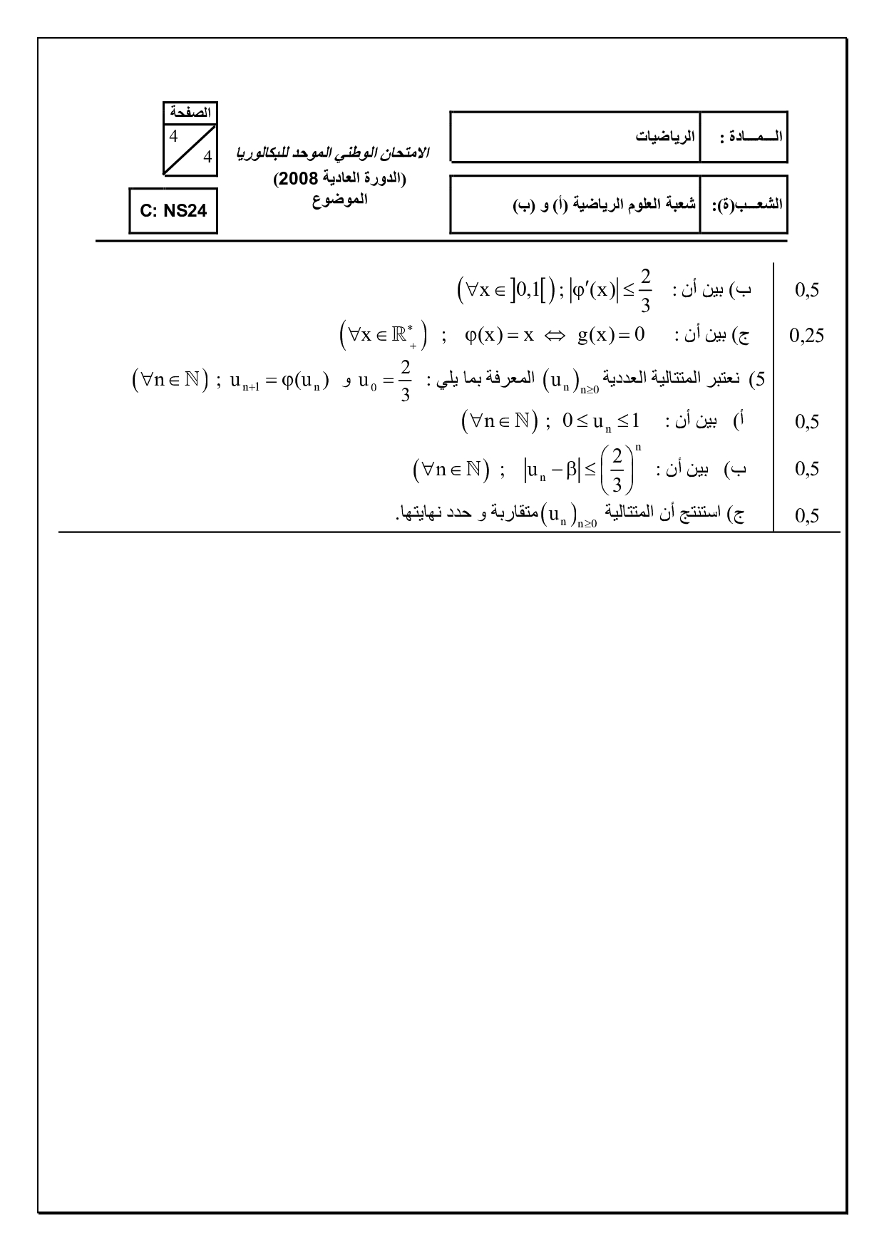 الرياضيات علوم رياضية 2008 الدورة العادية - الموضوع