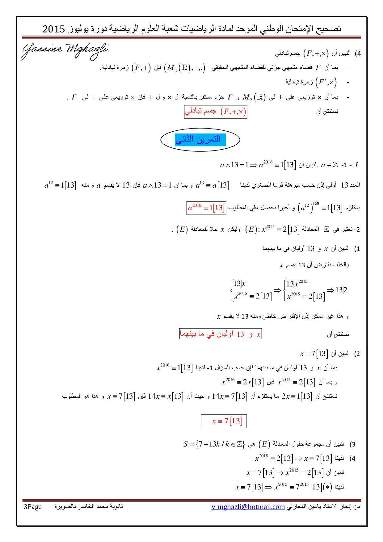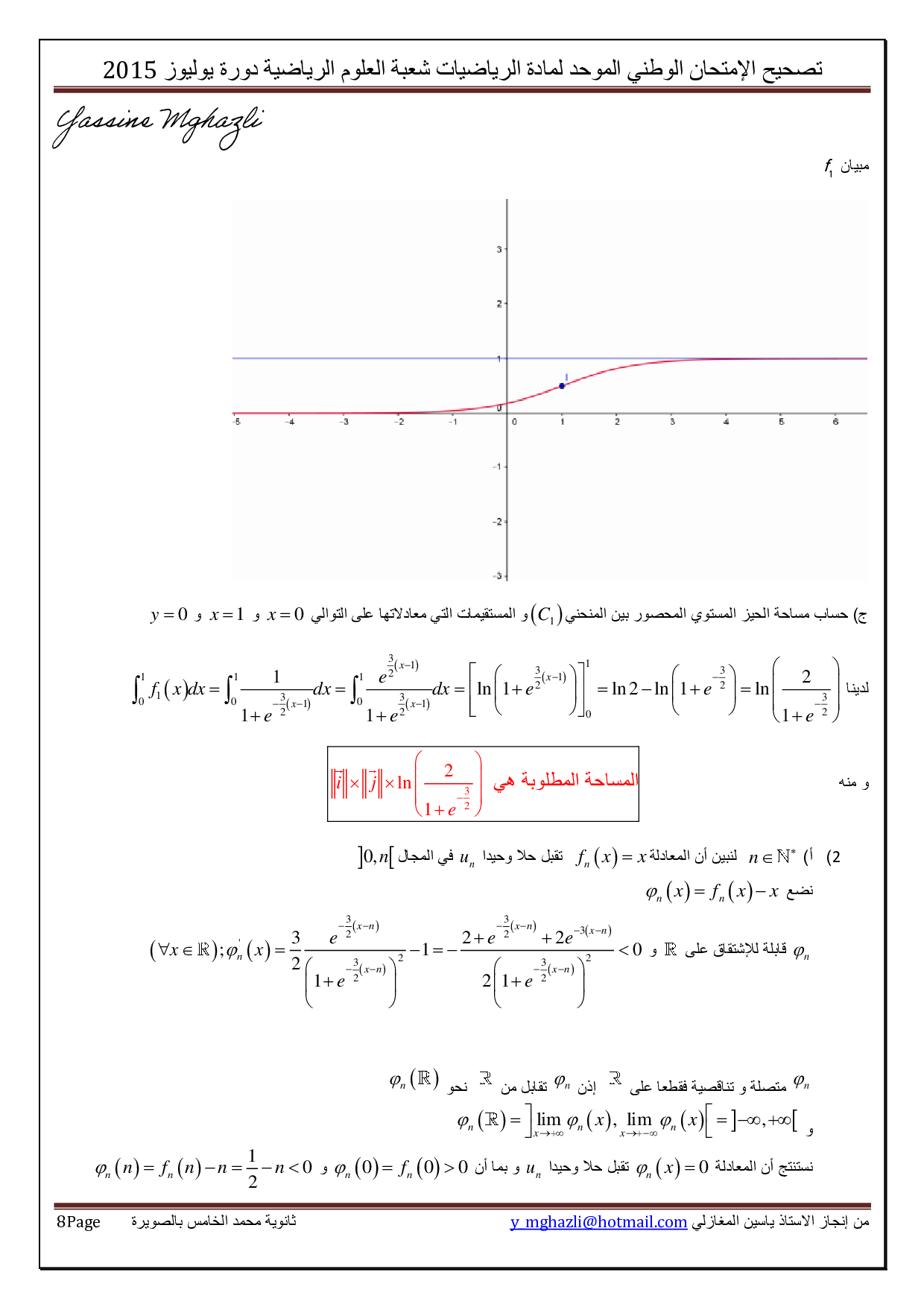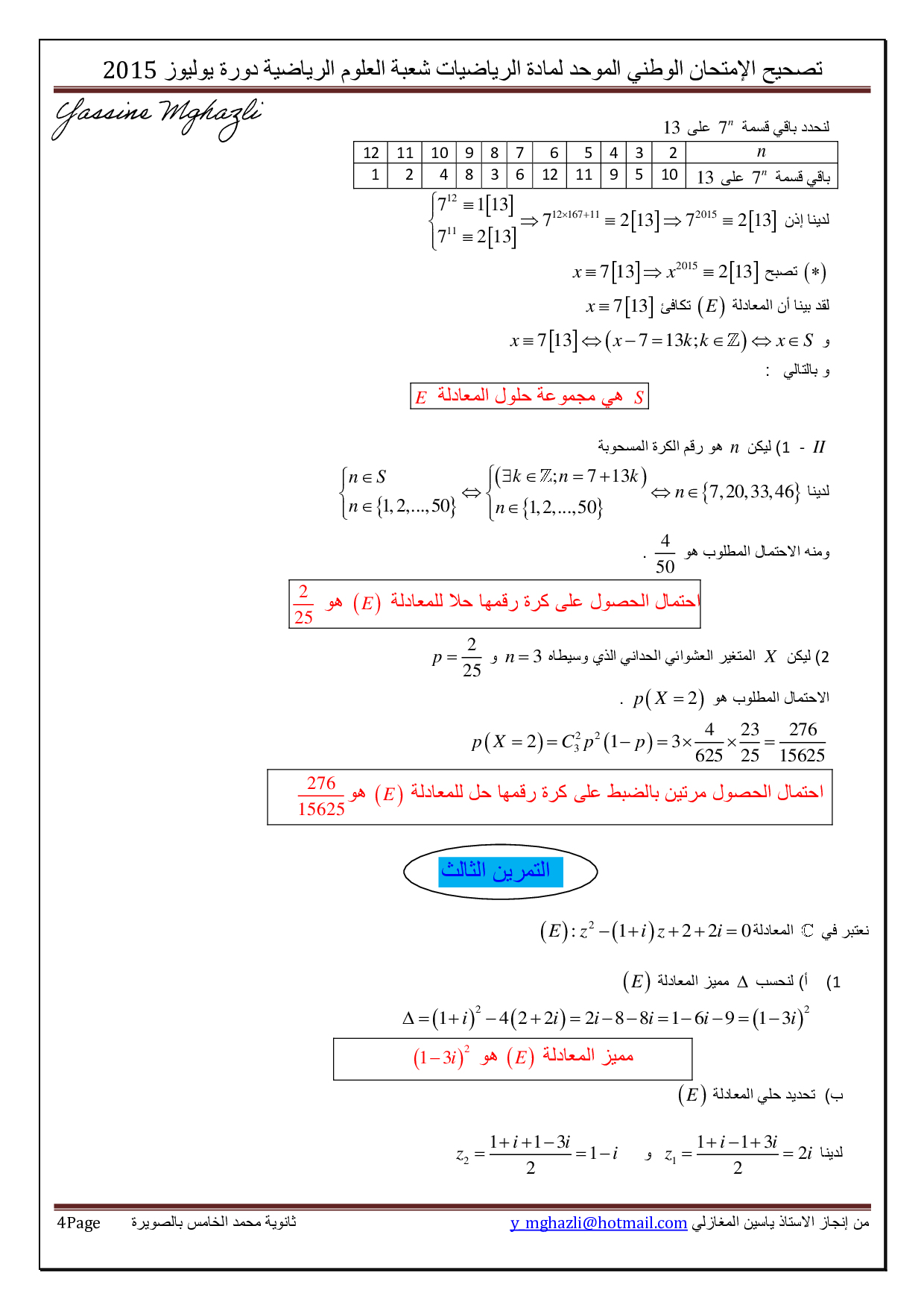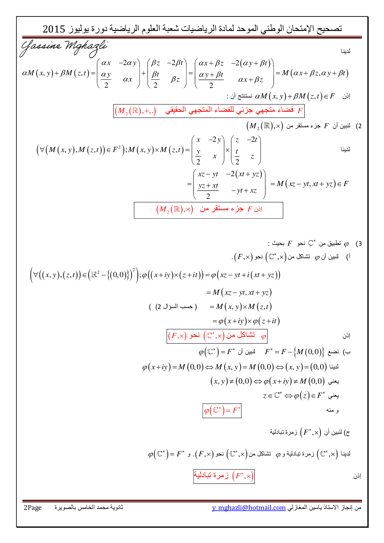 الرياضيات علوم رياضية 2015 الدورة الإستدراكية - التصحيح
