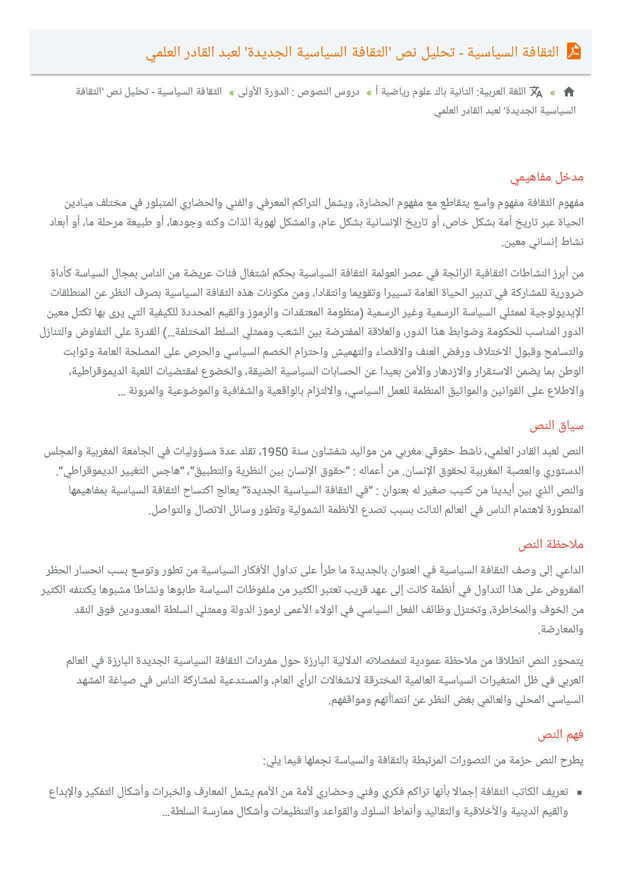 الثقافة السياسية - تحليل نص 'الثقافة السياسية الجديدة' لعبد القادر العلمي