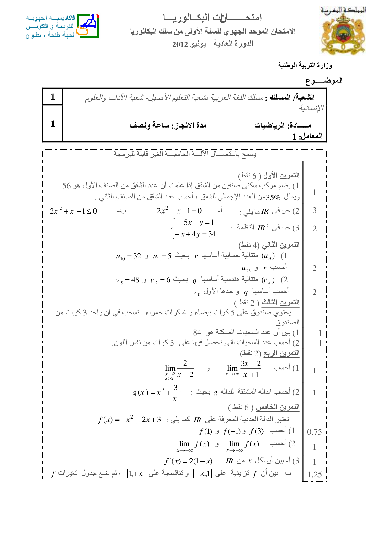 الرياضيات: الأولى باك آداب وعلوم إنسانية