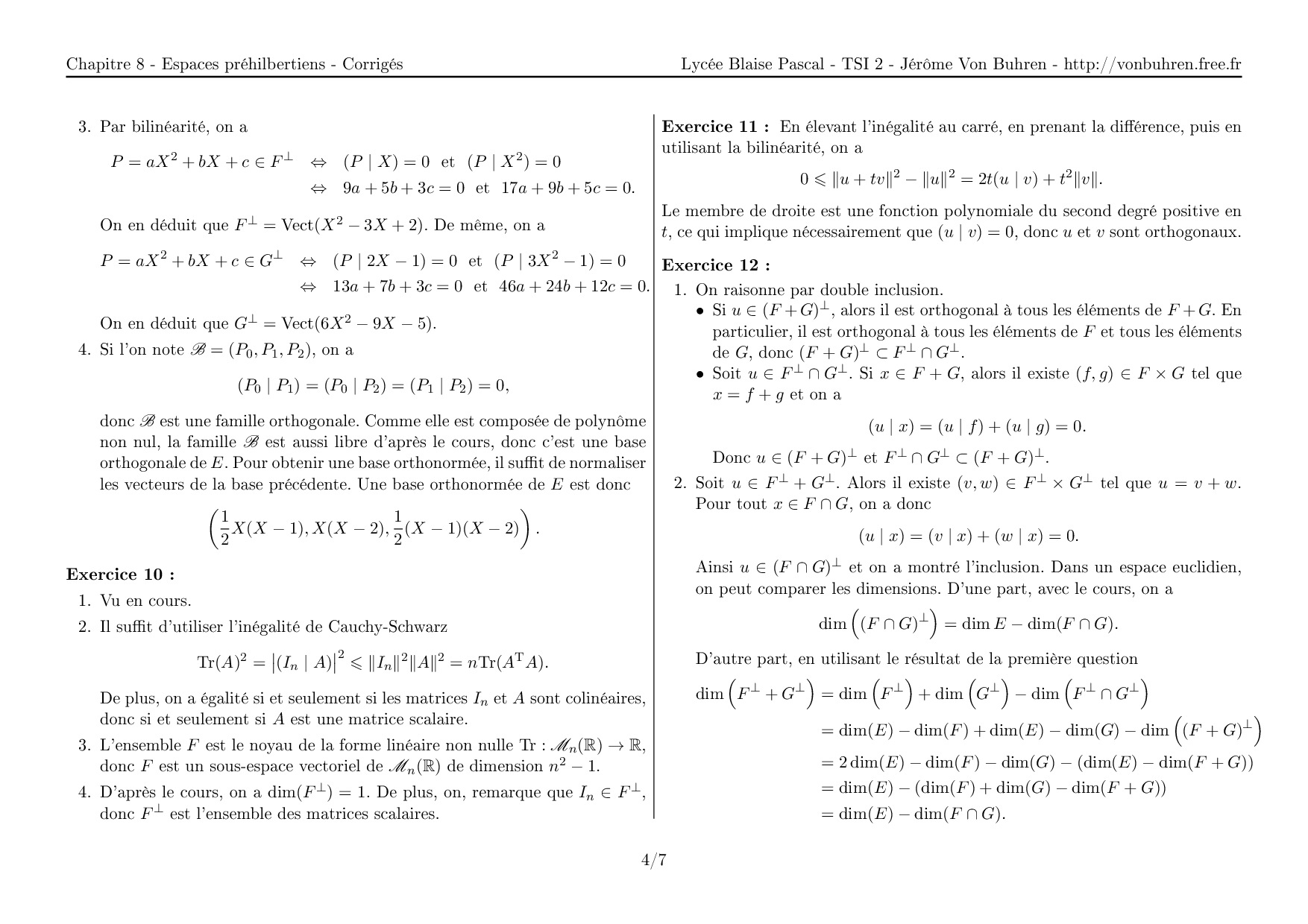Corrigés Exercices Espaces préhilbertiens réels