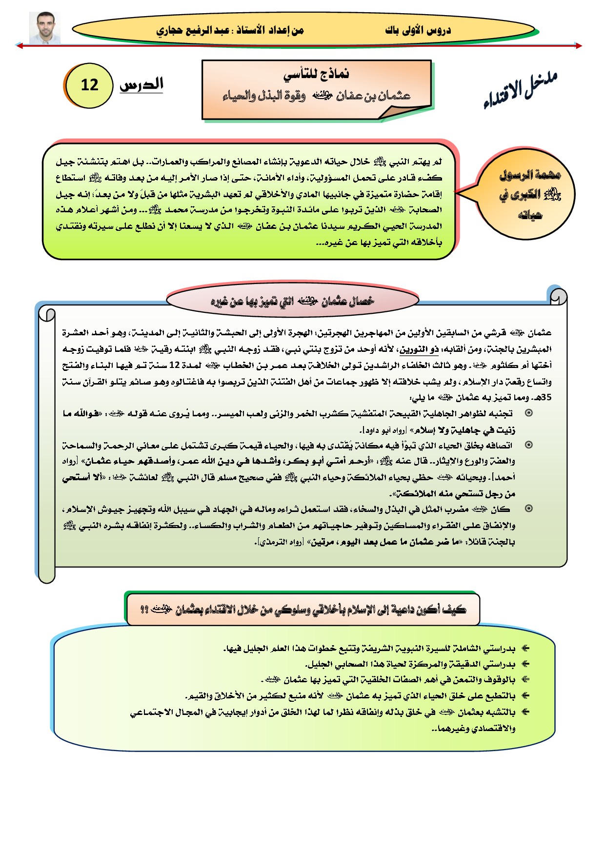 نماذج للتأسي: عثمان بن عفان وقوة البذل والحياء - ملخص الدرس