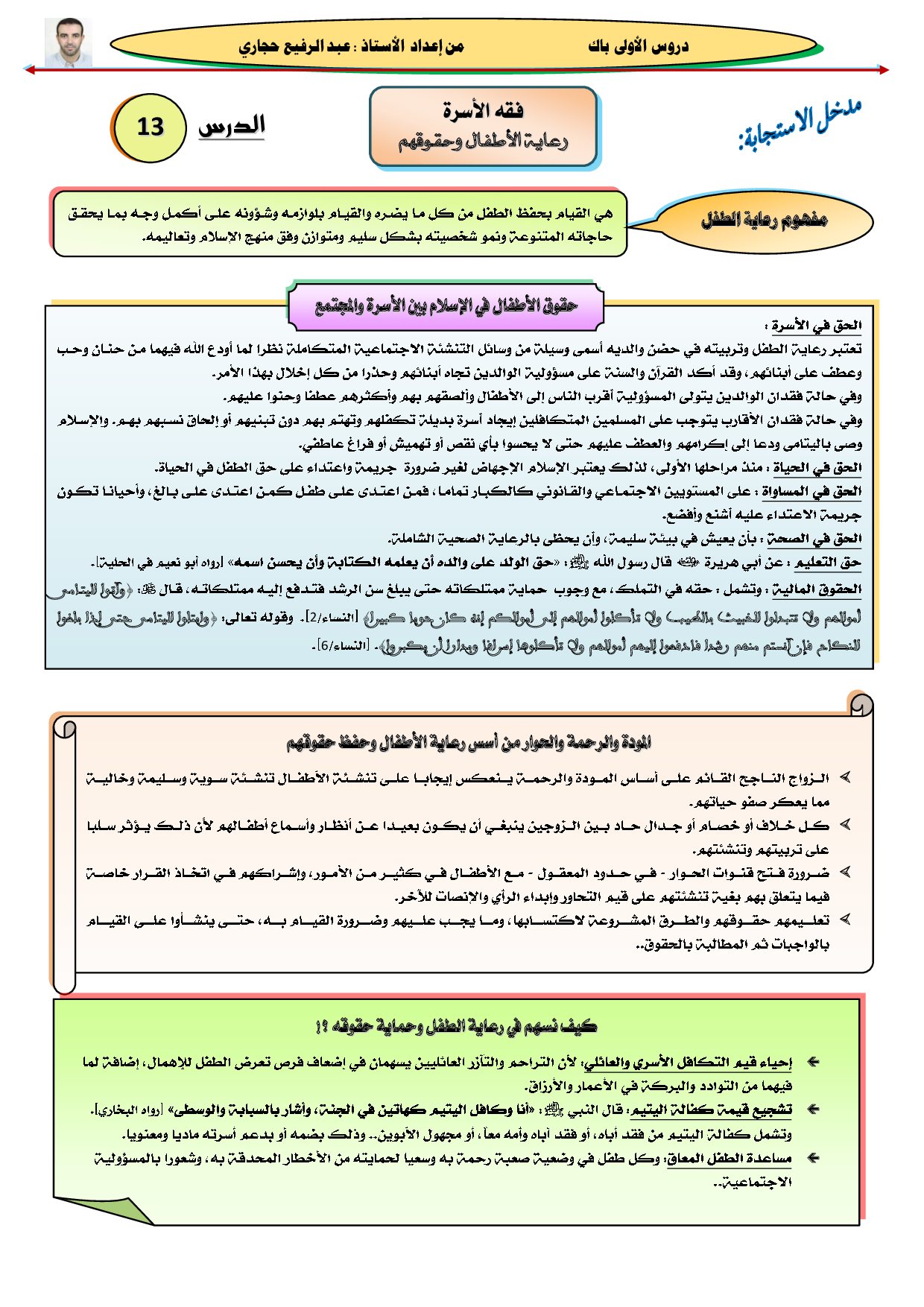 فقه الأسرة: رعاية الأطفال وحقوقهم - ملخص الدرس