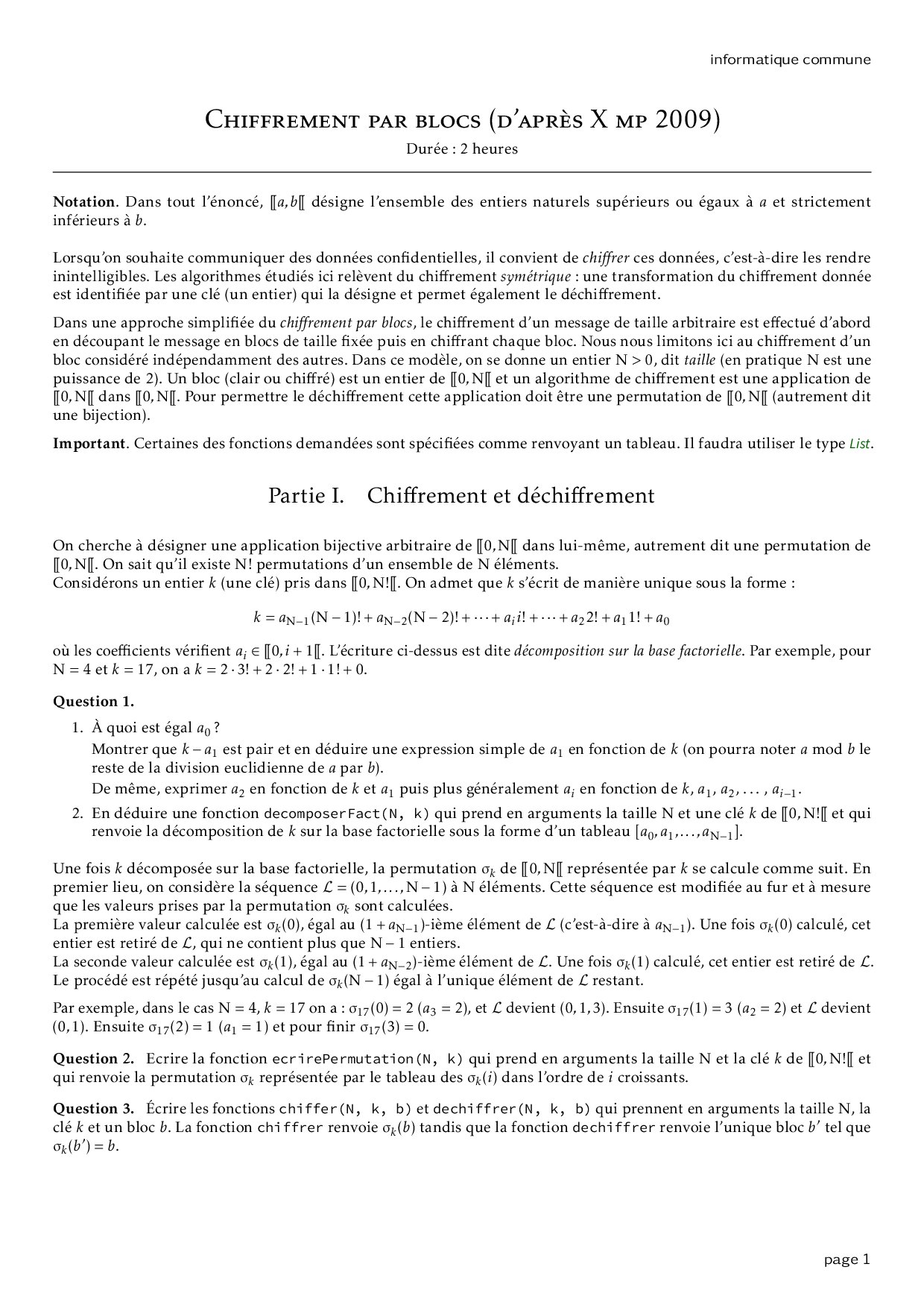Devoir 12 : Chiffrement par blocs (X MP 2009) : Épreuve