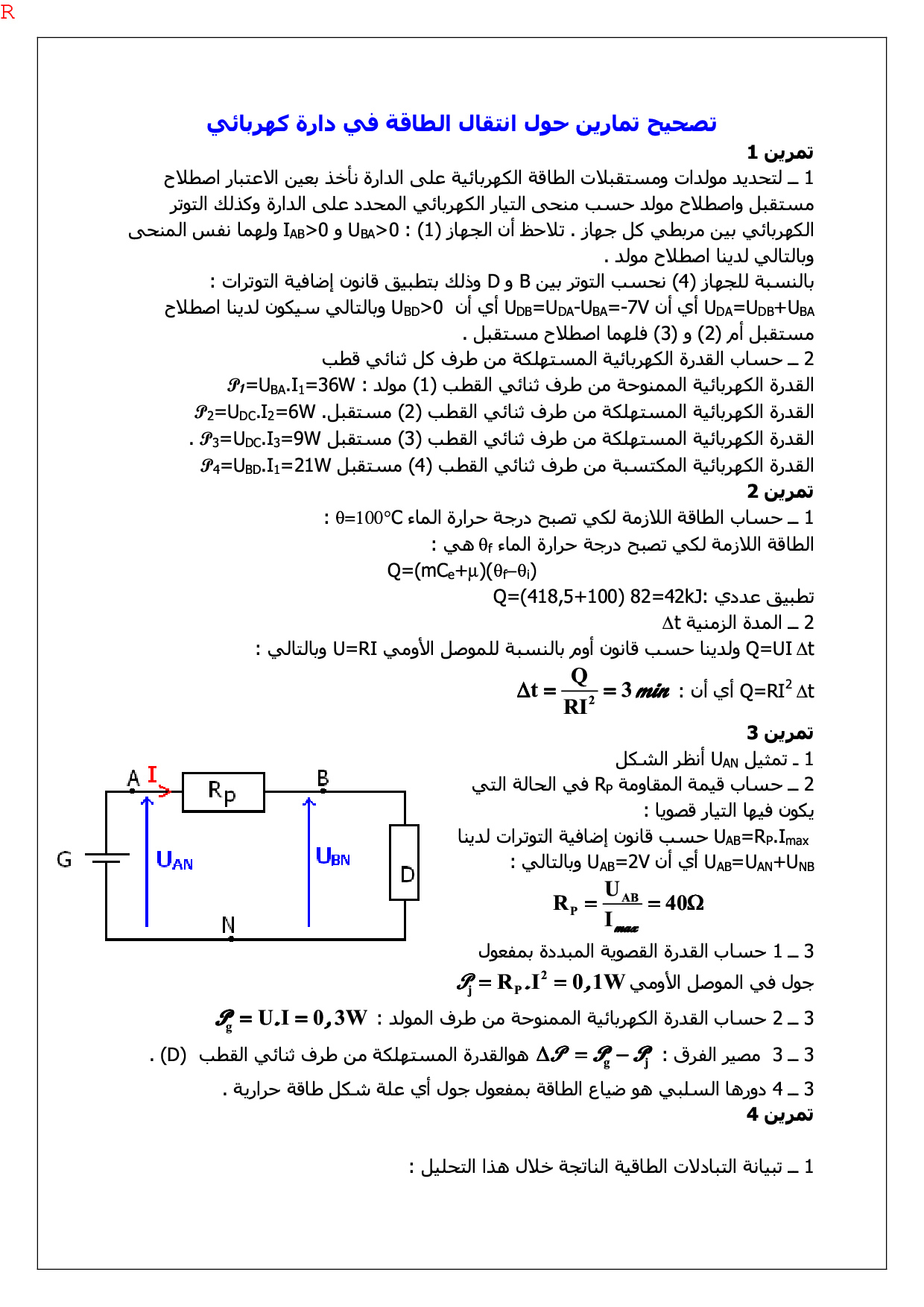 انتقال الطاقة في دارة كهربائية - تصحيح سلسلة التمارين 1