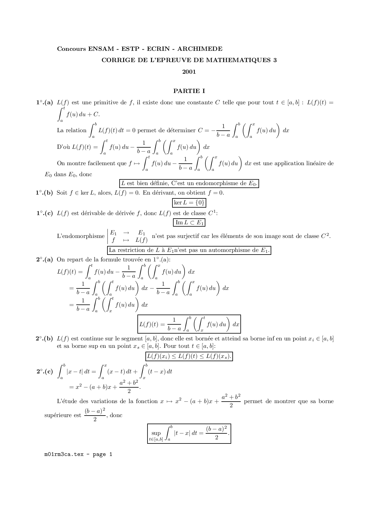 E3A MP 2001 Maths 3 Corrigé